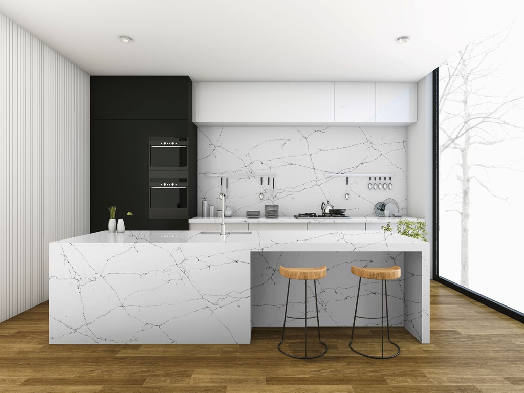 Use Bianco Drift to brighten compact kitchens or create a serene focal point on large islands. The soft white base and understated grey veining pair beautifully with white or light‑grey Shaker doors for an airy feel, or with warm oak and walnut for natural contrast. For a modern look, add matte black or brushed nickel hardware and pale greige walls. A full‑height splashback in the same slab achieves a seamless, marble‑effect backdrop, while 100 mm upstands deliver a neat, cost‑effective finish. Pencil‑round edges provide a refined, family‑friendly profile; mitred waterfall ends add drama to islands while keeping the veining visually continuous.