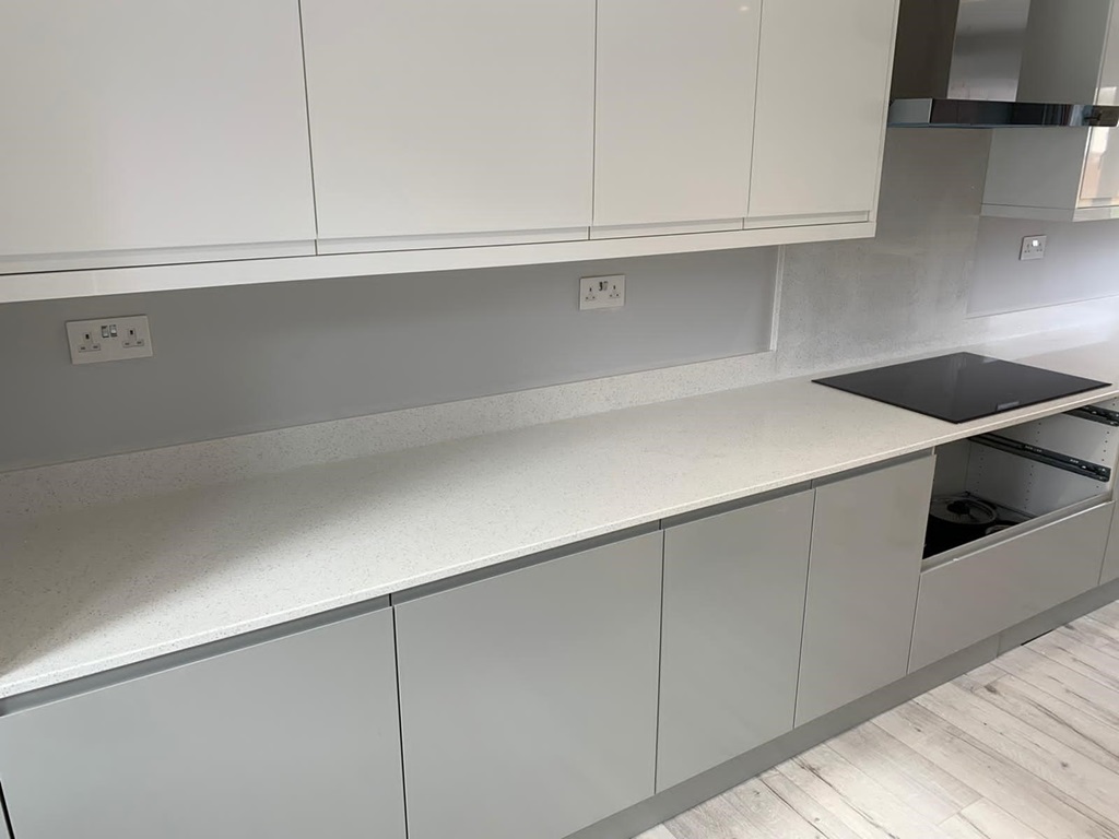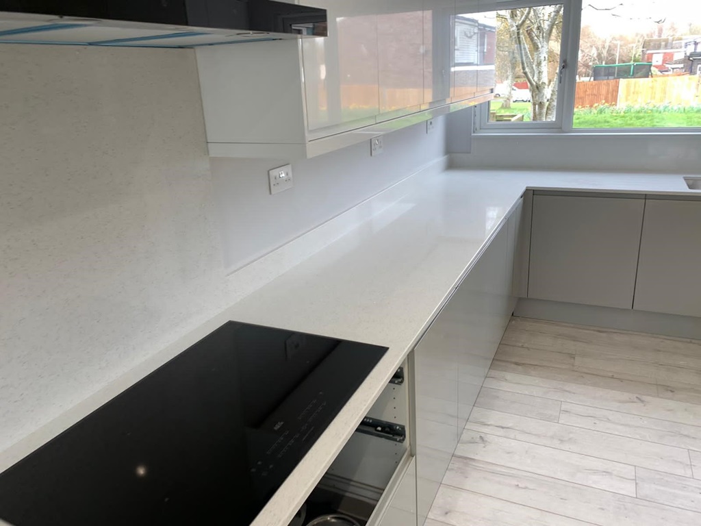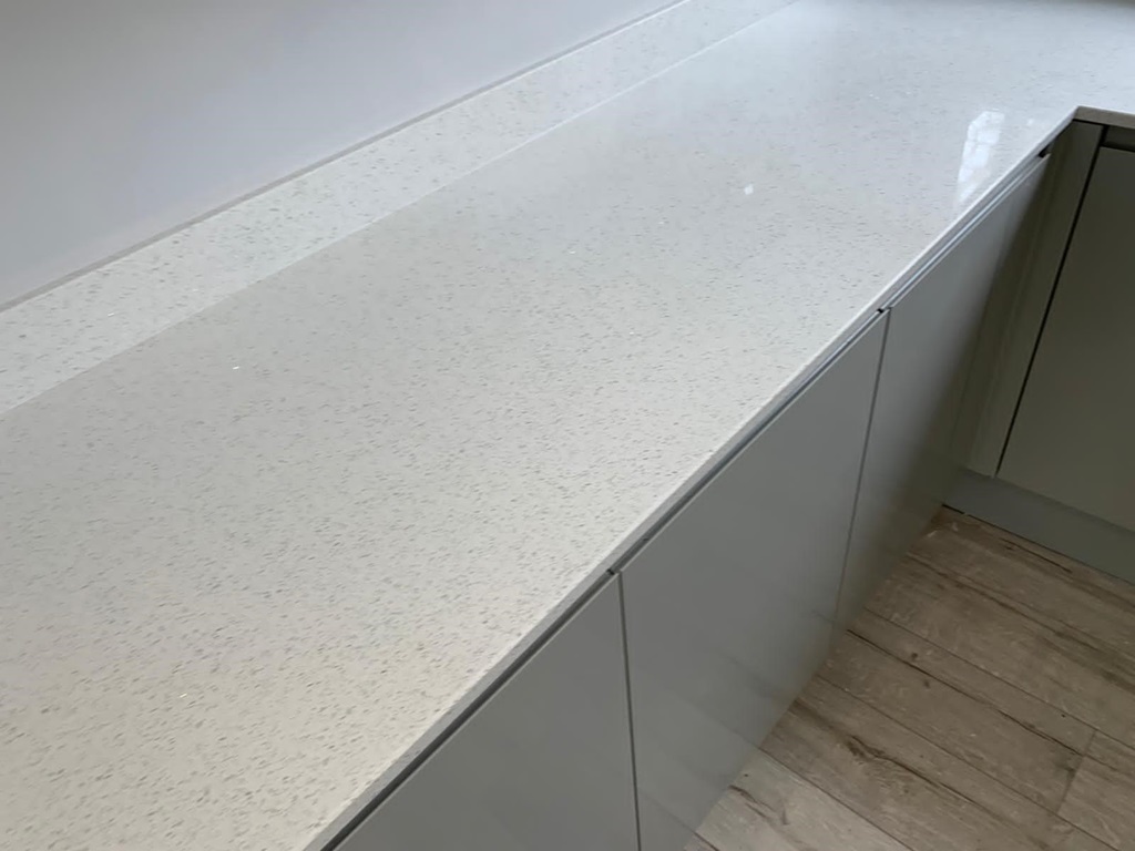 We work to keep popular Classic Quartz Stone colours such as Brillo Branco available for fast turnaround. For in‑stock slabs, typical installation is around seven days from digital templating. During a home visit, we bring samples so you can assess the white tone and subtle sparkle under your lighting, confirm sink, tap, and hob cut‑outs, plan joint positions, and receive a same‑day itemised quote covering slabs, fabrication, splashbacks, and fitting.