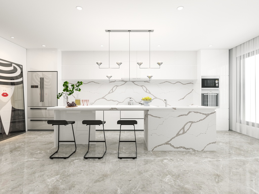 Calacatta Nova’s high quartz content supports abrasion resistance and low water absorption, helping manage stains from coffee, wine, and oils when wiped promptly. Factory‑controlled slab tolerances deliver consistent thickness and flatness for tight joints, accurate sink and hob cut‑outs, and straight overhangs. Because veining varies naturally between slabs, vein‑aware joint planning during templating keeps the pattern reading as continuous across seams for a cohesive, high‑end finish.