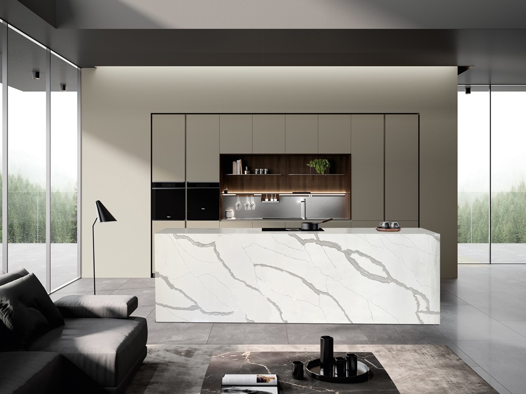 Use Calacatta Nova to anchor islands, long perimeter runs, and full‑height splashbacks where the grey veining can be appreciated. Pair with off‑white, stone, or pebble cabinetry for a serene scheme, or contrast with walnut, oak, graphite, or midnight blue for depth. Polished chrome and brushed nickel echo the cool grey veins; satin brass offers a warm accent in transitional spaces. Consider book‑matched splashbacks over the hob to mirror the vein, and mitred waterfall ends to carry the pattern seamlessly down island sides. Pencil‑round edges provide a family‑friendly profile; chamfered and mitred edges add tailored definition without visual heaviness.