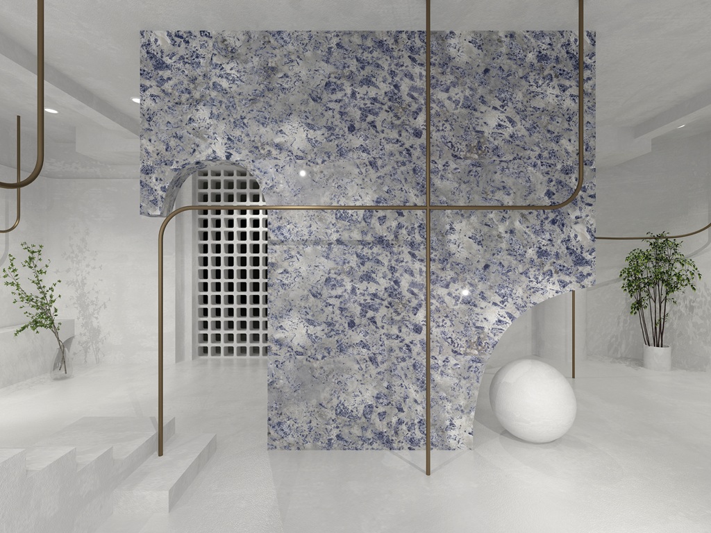 Blue Lagoon Quartz is supplied in a jumbo slab size of 3200 × 1600 mm, allowing for expansive layouts with minimal joins across long worktop runs and feature islands. Available in both 20 mm and 30 mm thickness options, it supports slim contemporary edges as well as heavier profiles that suit statement surfaces. Mitred detailing, waterfall ends, and full-height splashbacks can be specified to carry the fractured pattern naturally across planes and keep visual continuity through corners, returns, and vertical drops. Where joins are required, careful placement helps maintain the slab’s balance by aligning fragment distribution and preserving a cohesive flow across connected sections.