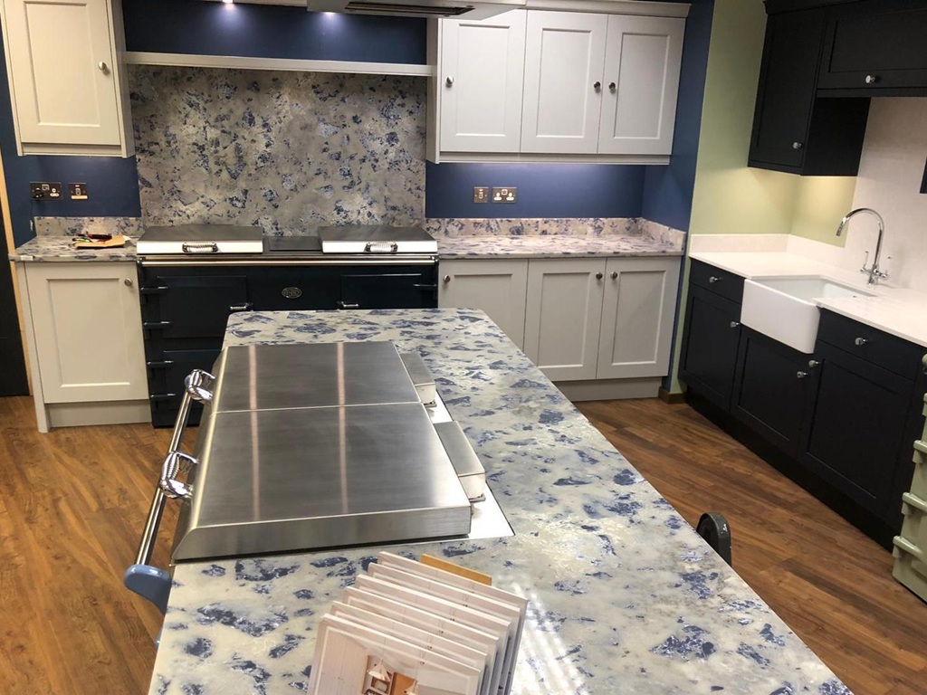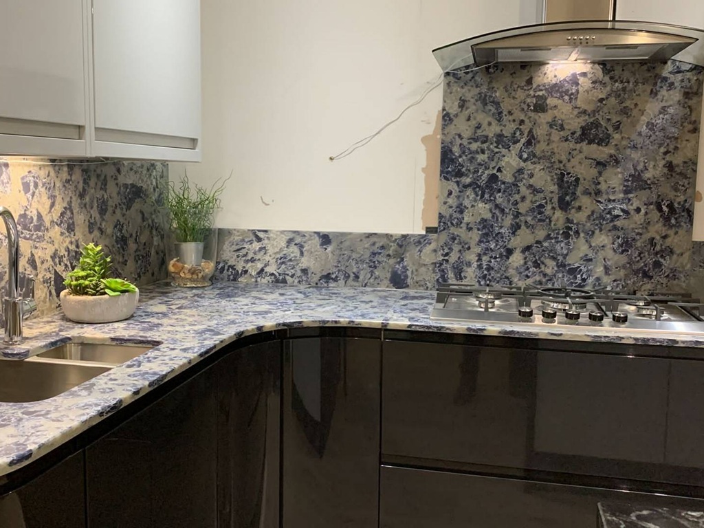 Because Blue Lagoon Quartz has bold fragment movement rather than directional veining, planning focuses on visual balance, join positioning, and edge decisions that support a clean finished look. Accurate templating helps align corners, cut-outs, and feature ends so the fractured pattern reads intentional across sinks, hobs, corners, and waterfall panels. Thoughtful detailing also supports long-term performance by ensuring correct support, tidy sealing at junctions, and precise fabrication around fixtures and appliances in everyday environments.