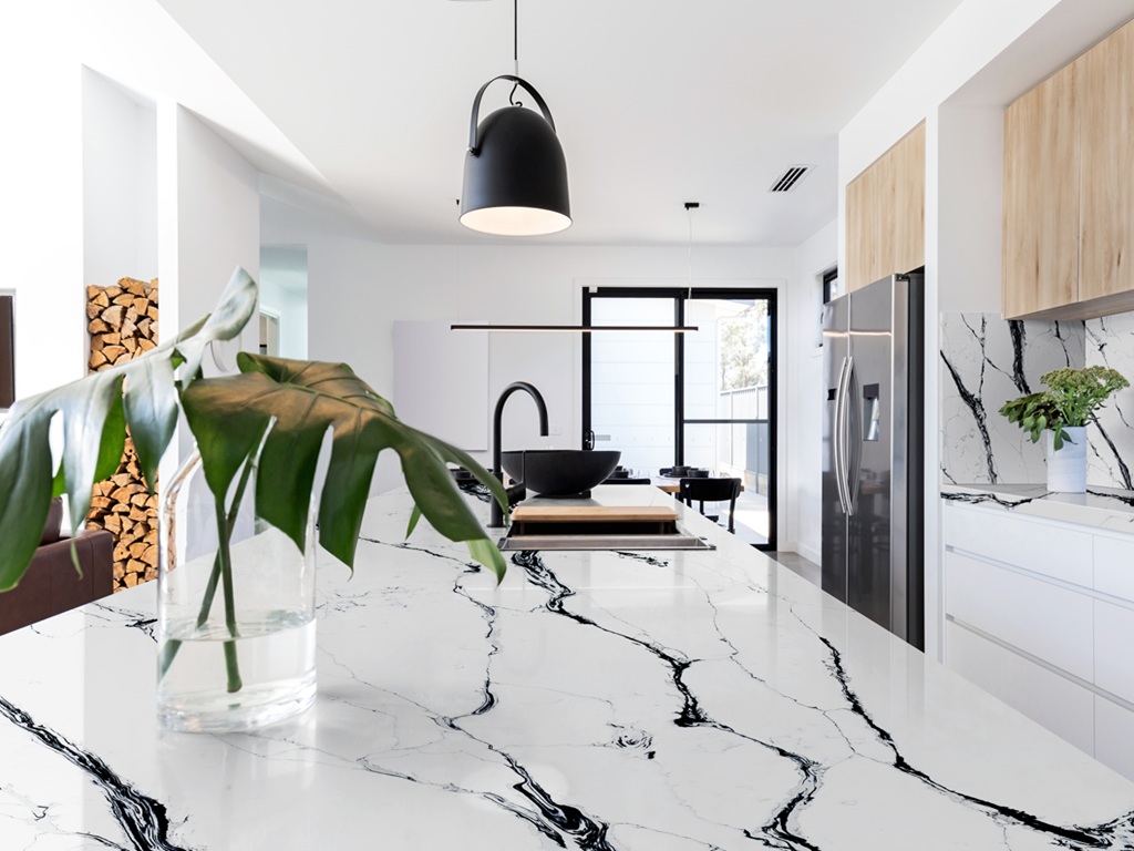 Calacatta Black Fusion Quartz Nile Stone works particularly well in interiors where contrast and visual structure are key. The dramatic veining pairs naturally with dark cabinetry, matte black fixtures, and architectural finishes, while the warm base tone balances lighter woods and neutral palettes. Used across islands, waterfall ends, or full-height splashbacks, the slab’s flowing movement creates strong focal points while maintaining continuity across connected surfaces.