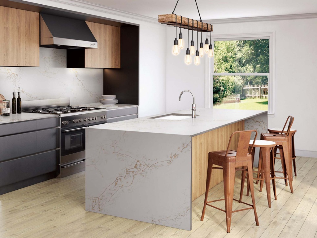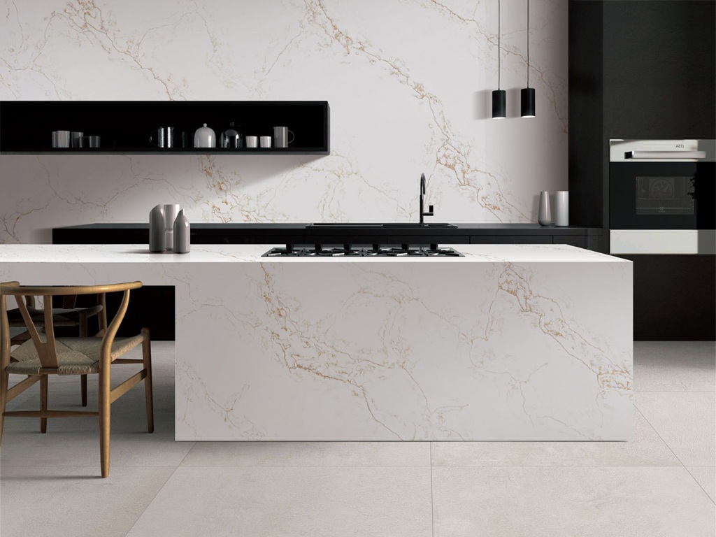 Calacatta Fantastico Quartz Nile Stone works particularly well in interiors that benefit from warmth and definition. The soft gold veining pairs naturally with matte black, deep charcoal, and warm timber cabinetry, while also remaining balanced alongside neutral finishes. Used on islands, waterfall ends, or full-height splashbacks, the slab’s flowing movement creates focal points that maintain visual continuity across connected surfaces.
