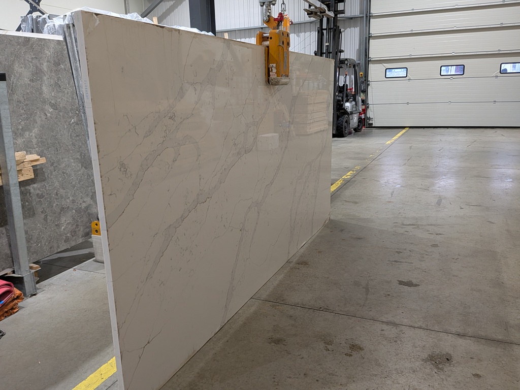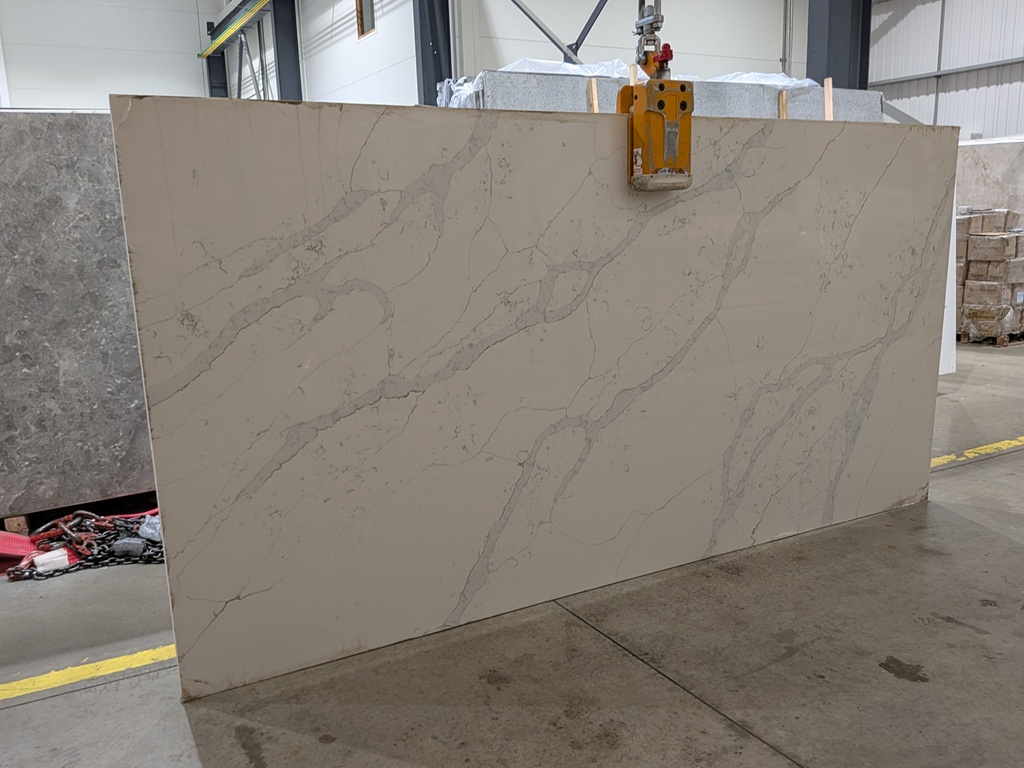 The Calacatta Gold quartz from Nile Stone slab features a warm, soft white base that reads gently creamy rather than stark. Broad grey veining moves diagonally across the surface with natural variation in thickness, creating clear directional flow without overcrowding the background. Between the larger veins, fine hairline tracery and faint mineral speckling add depth, while subtle gold-beige accents appear intermittently along parts of the veining to introduce warmth and definition. This balanced patterning gives Calacatta Gold Quartz a confident presence across large worktop areas, waterfall ends, and feature installations while maintaining an organised, refined look.