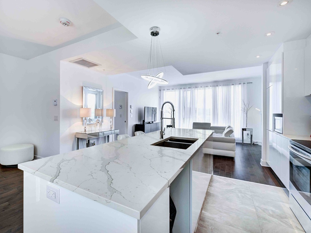 Careful planning of vein direction, joints, and edge profiles ensures Calacatta Gold Quartz reads naturally across sinks, hobs, corners, and feature ends. Positioning key veins through statement areas such as island waterfalls or splashbacks helps the slab feel intentional rather than random, while accurate alignment at joins supports a continuous look across connected surfaces. Precise fabrication detailing also helps maintain clean shadow lines and crisp edges, supporting long-term performance and preserving the slab’s warm base tone and subtle gold-beige accents.