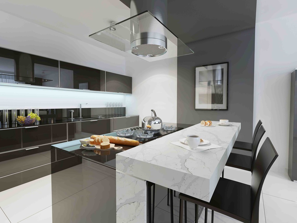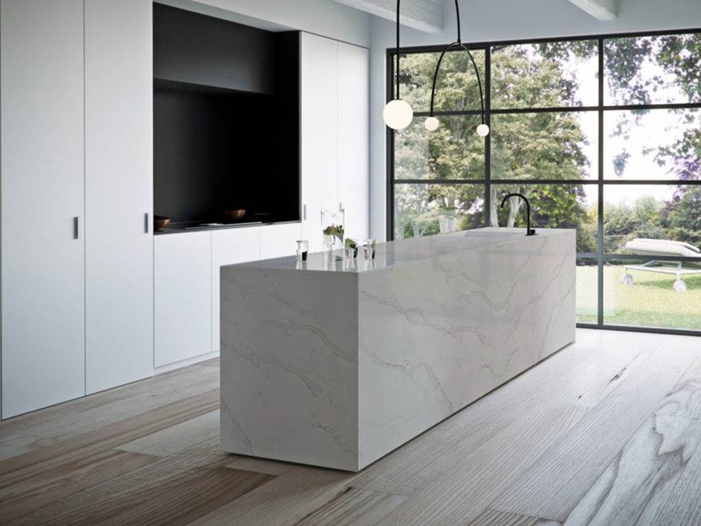 Calacatta Gold Quartz Nile Stone works especially well in spaces that benefit from warmth and contrast without heavy visual noise. The warm white base pairs naturally with light oak, walnut, and neutral cabinetry, while the grey veining provides structure against matte black, charcoal, and deep-toned finishes. The occasional gold-beige notes help connect the surface to brass hardware, warm metals, and softer paint colours, creating cohesion across the room. Used on islands, waterfall ends, or full-height splashbacks, the slab’s directional movement creates focal points that still feel calm and controlled, helping connected surfaces read as one continuous design.