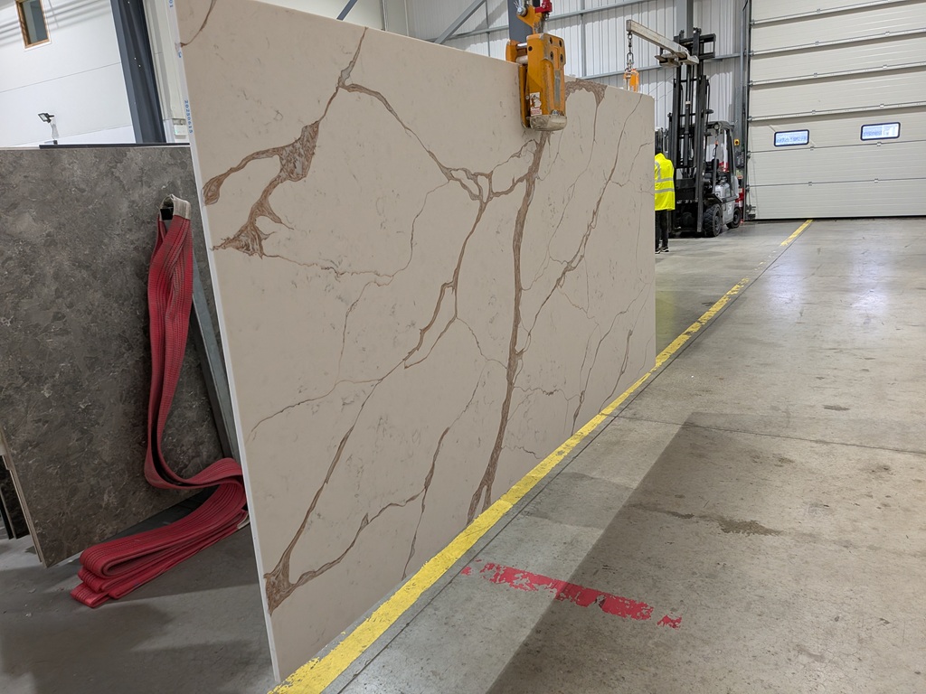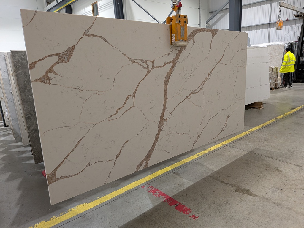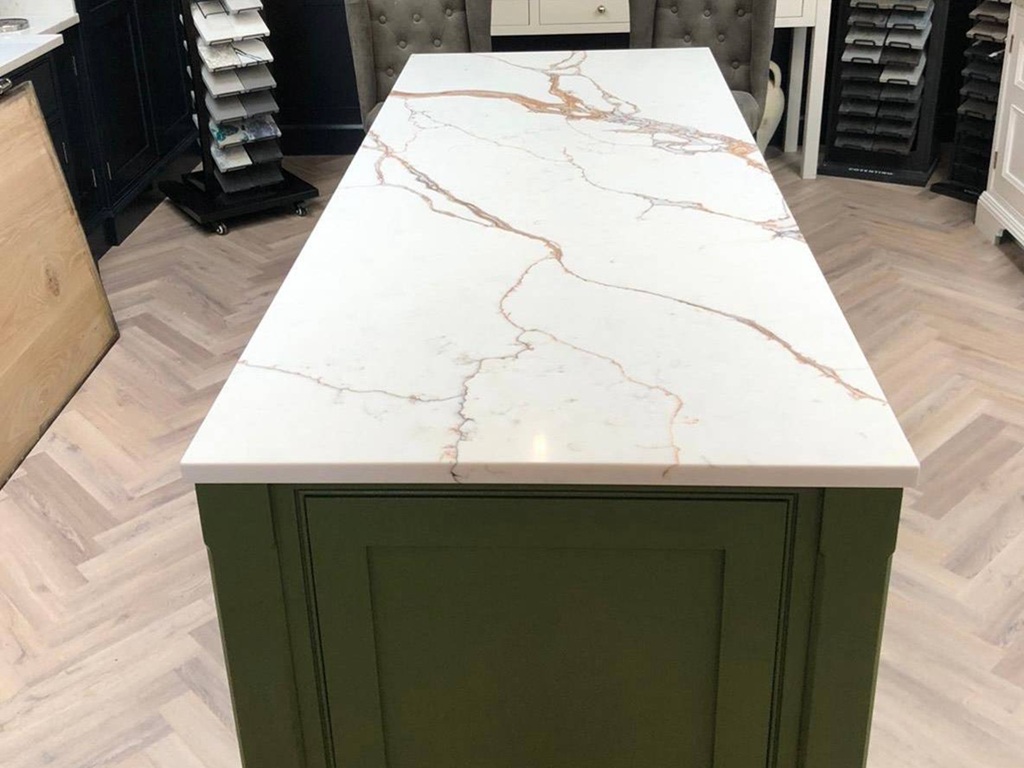 Calacatta Oro Satin Quartz Nile Stone is well suited to kitchen worktops, islands, splashbacks, utility areas, and bathroom vanities. Its warm colour palette and flowing veining provide visual interest in open-plan layouts while remaining controlled enough for continuous surface applications.