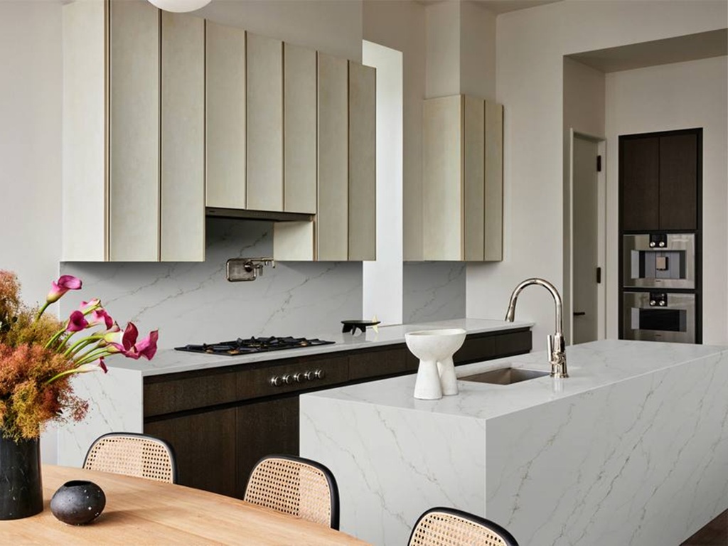 Calacatta Soft Gold Quartz Nile Stone complements interiors that benefit from warmth and subtle contrast. The fine gold veining pairs naturally with cream, beige, taupe, and light wood cabinetry, while also softening darker finishes such as charcoal or muted bronze tones. Used across islands, waterfall ends, or full-height splashbacks, the slab’s gentle movement adds interest without disrupting visual flow, supporting cohesive open-plan layouts.