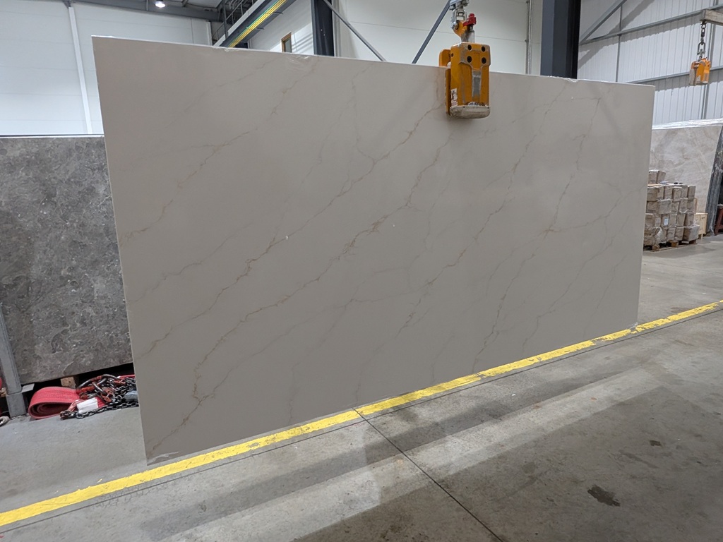 Calacatta Soft Gold Quartz Nile Stone is well suited to kitchen worktops, islands, splashbacks, utility areas, and bathroom vanities. Its warm veining and controlled movement provide gentle definition in open-plan layouts while remaining suitable for continuous surface applications.