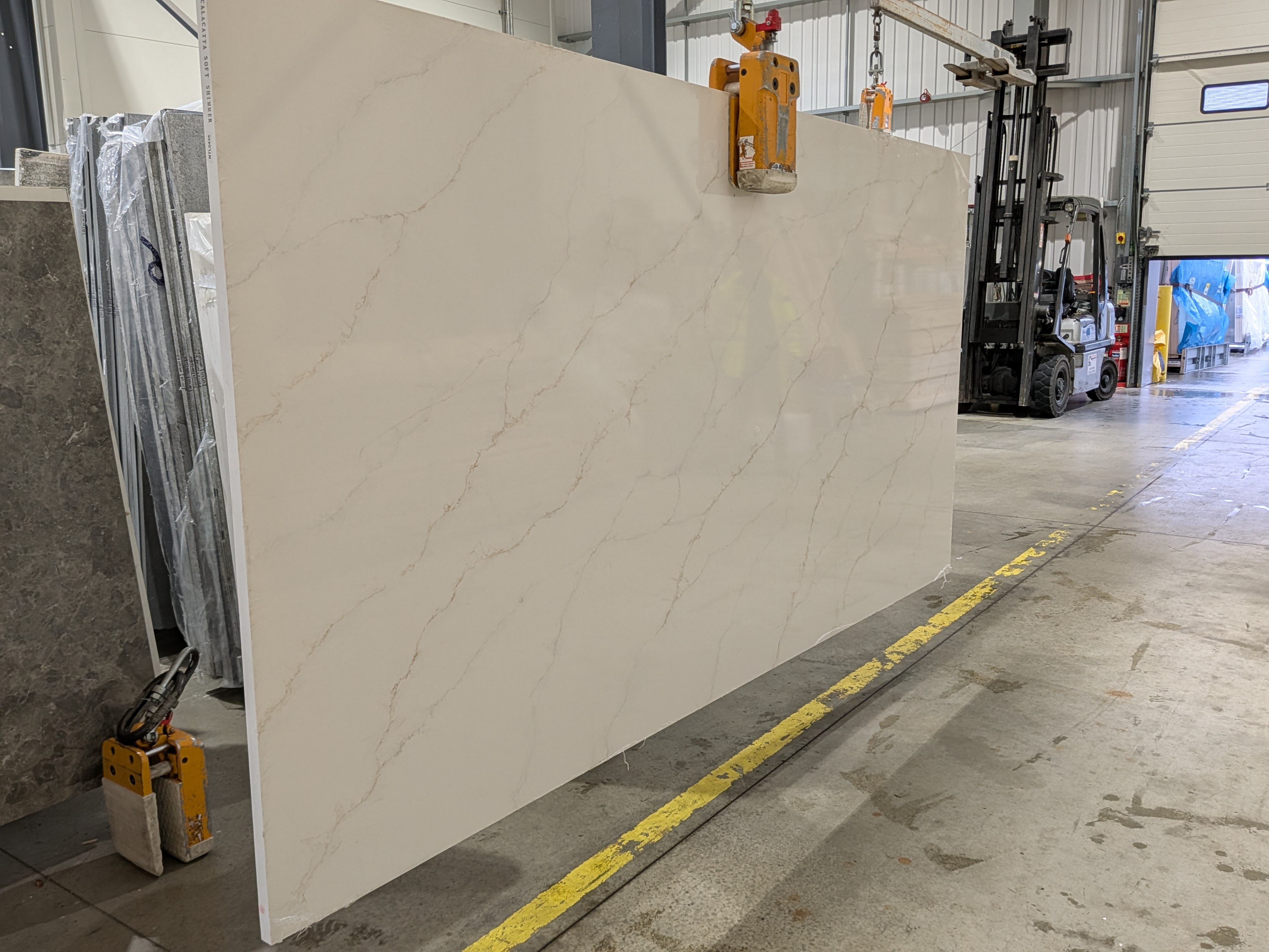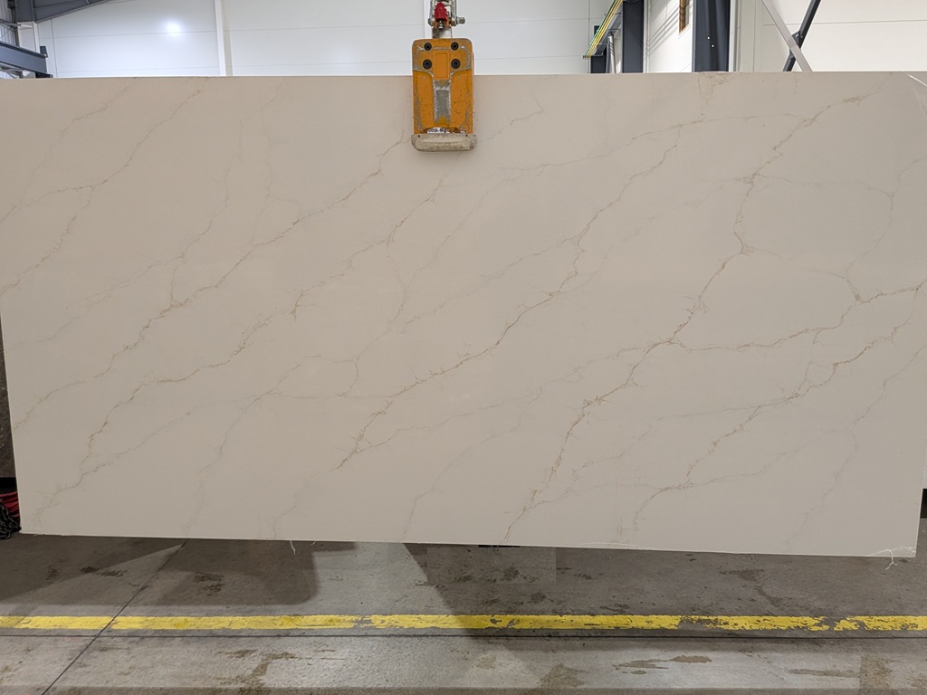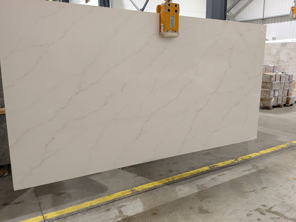 The Calacatta Soft Shimmer quartz from Nile Stone slab features a warm white base that delivers a calm and refined surface appearance. Fine grey veining flows gently across the slab, layered with subtle champagne and soft gold highlights that introduce understated depth. A delicate mineral shimmer is present within the surface, catching light softly without appearing reflective or dominant. This balanced composition allows Calacatta Soft Shimmer Quartz to be elegant and controlled, making it well suited to expansive worktop areas, waterfall islands, and continuous installations where visual flow is essential.