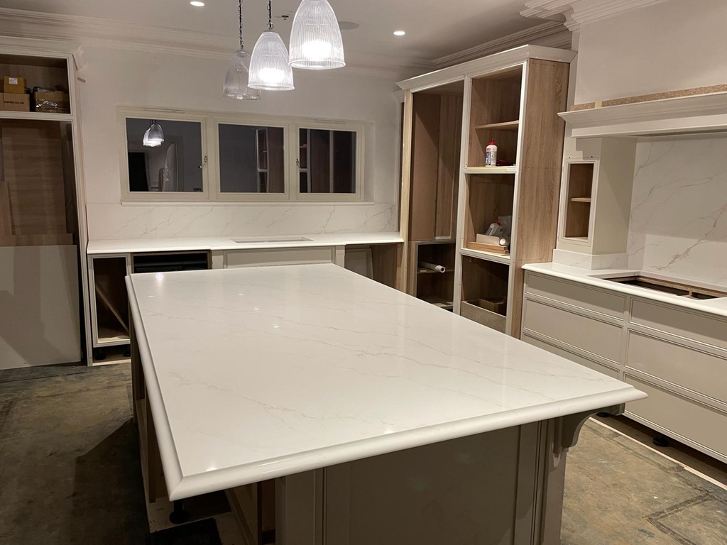 Careful planning of vein direction, joins, and edge profiles ensures Calacatta Soft Shimmer Quartz reads naturally across sinks, hobs, corners, and feature ends. Accurate slab alignment and thoughtful detailing help preserve the slab’s soft movement while supporting long-term performance in everyday environments.