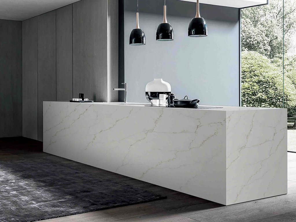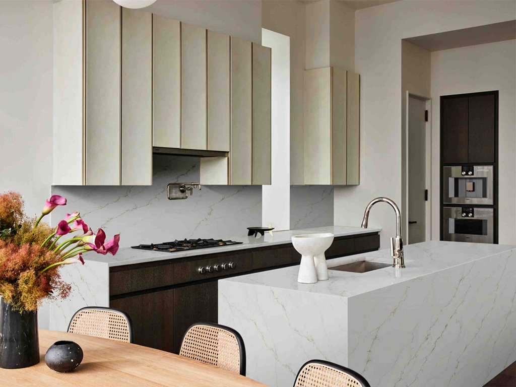 Calacatta Soft Shimmer Quartz Nile Stone works particularly well in interiors that benefit from subtle warmth and controlled contrast. The fine veining pairs naturally with charcoal, graphite, and soft black cabinetry, while the gentle gold shimmer complements warm greys, muted taupes, and natural wood finishes. Used on islands, waterfall ends, or full-height splashbacks, the slab creates visual interest without overpowering surrounding materials, maintaining a cohesive and well-balanced interior palette.