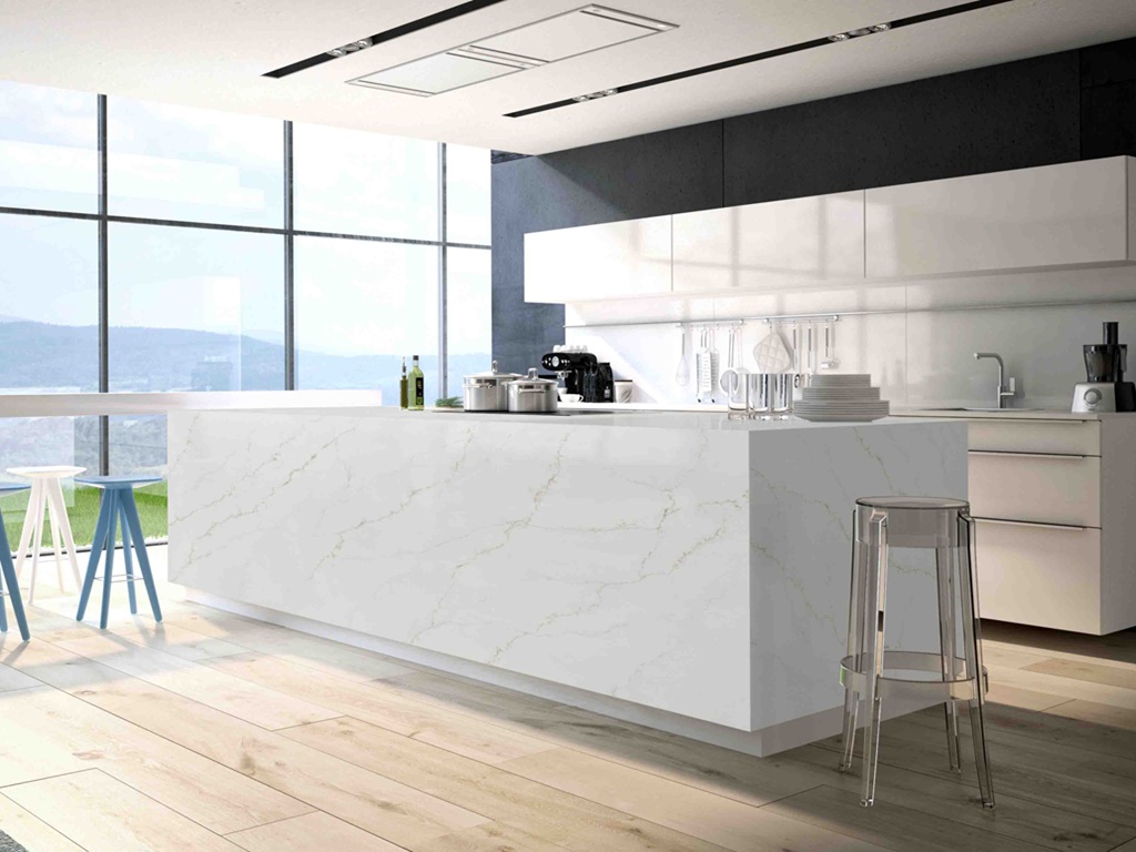 Calacatta Soft Shimmer Quartz Nile Stone is suitable for kitchen worktops, islands, splashbacks, utility rooms, and bathroom vanities. Its warm white base, fine veining, and subtle shimmer provide definition within open-plan layouts while remaining controlled enough for continuous surface applications.