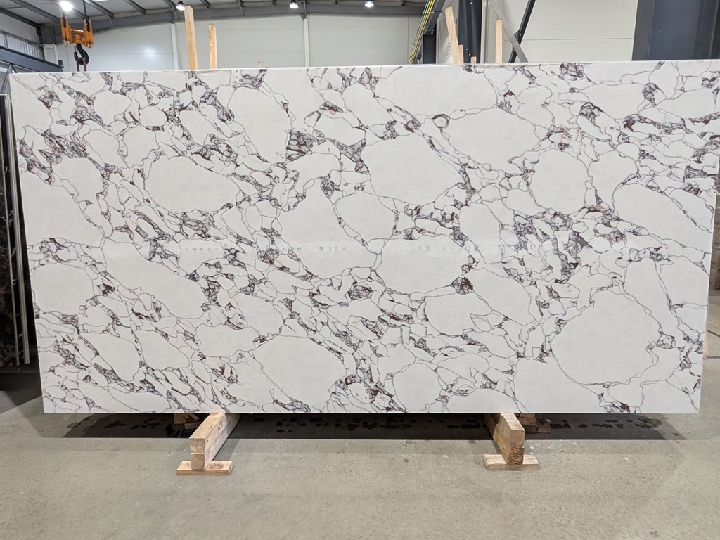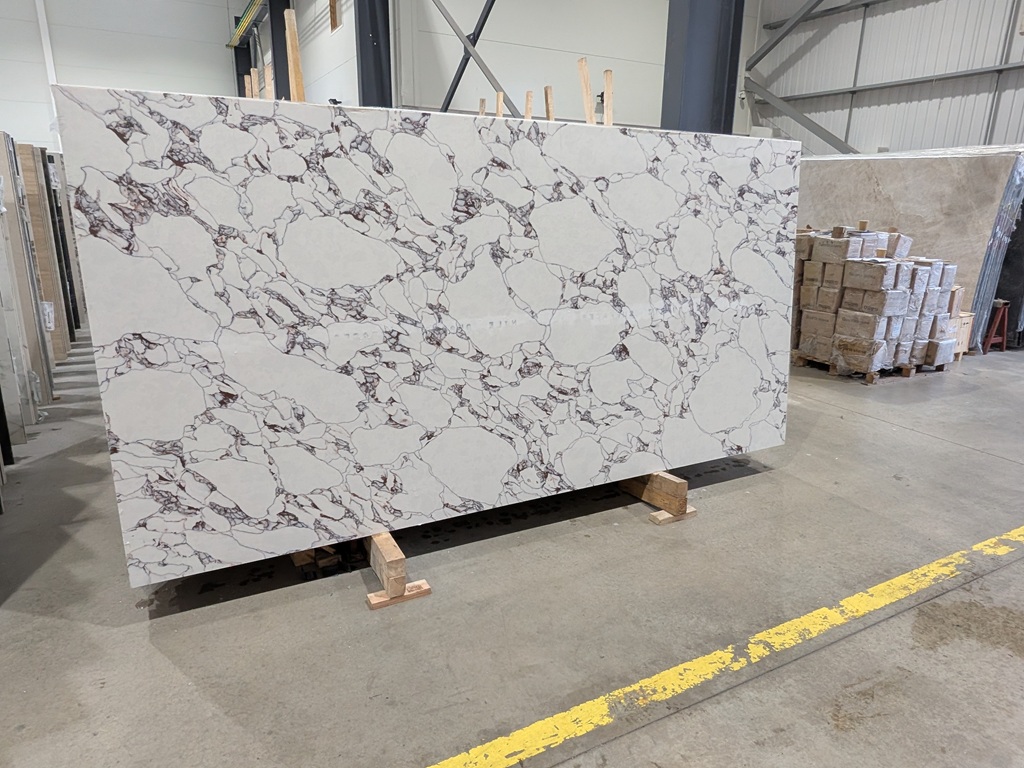 Engineered quartz construction provides a dense, low-absorption surface that supports daily kitchen and bathroom use. Calacatta Viola Quartz Nile Stone is resistant to common household spills and surface wear when cared for correctly, helping maintain the slab’s clean base tone and the crisp definition of its burgundy and charcoal veining over time. Consistent slab calibration also supports accurate templating, clean joins, and precise cut-outs during fabrication, which is particularly important for large islands and feature runs where alignment and continuity influence the finished look.
