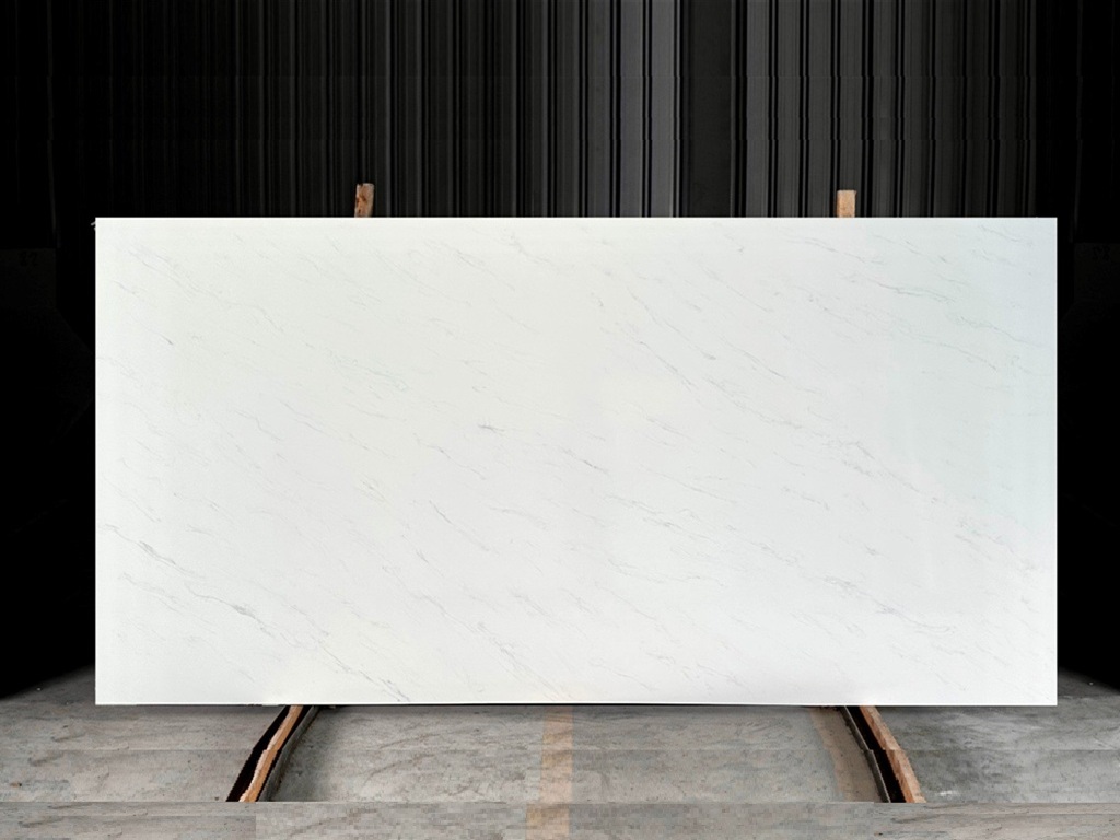 The Calacatta Volakas quartz from the Nile Stone slab features a bright white base that keeps the surface looking crisp and open. Soft grey veining flows gently across the slab in fine, elongated lines, with occasional feathered breaks that add natural-looking movement without heavy contrast. Subtle mineral-style shading appears in places around the veins, giving the pattern depth while maintaining a calm, refined balance. This controlled veining makes Calacatta Volakas Quartz particularly suitable for large worktop layouts, islands, and splashback installations where continuity and lightness are important.