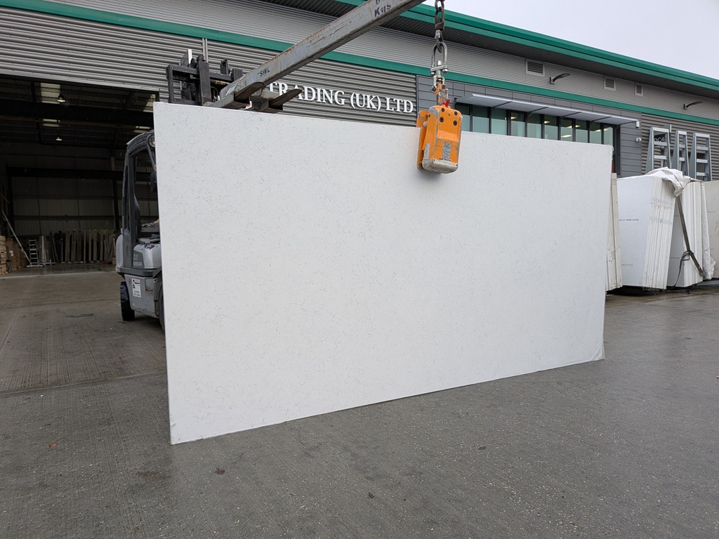 The Carrara Mist quartz from Nile Stone slab features a soft white base layered with gentle grey misting and finely dispersed mineral detail. Subtle, cloud-like markings move quietly across the surface rather than forming defined veins, creating a calm and evenly balanced appearance. This restrained patterning delivers visual texture without strong contrast, allowing Carrara Mist Quartz to read cleanly across large worktop runs, islands, and continuous surface applications.