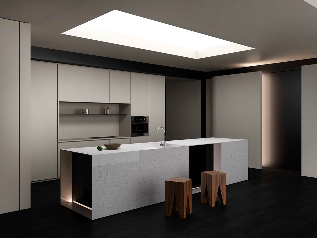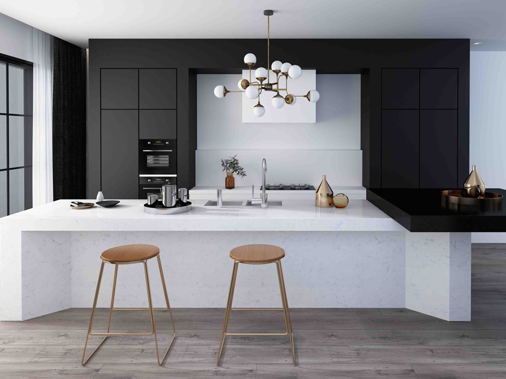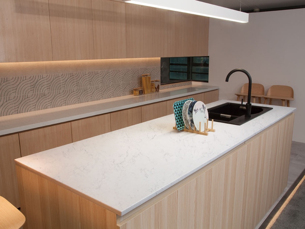 Carrara Satin Quartz Nile Stone works well in spaces that favour subtle contrast and softness over bold patterning. The gentle grey veining pairs naturally with light-toned cabinetry, warm neutrals, and soft wood finishes, while also providing a calm counterpoint to darker units. Used across islands, waterfall ends, and splashbacks, the satin surface helps reduce glare and maintains a consistent, composed appearance across open-plan layouts.