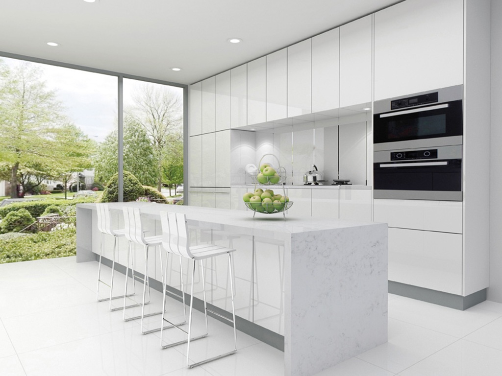 Carrara Satin Quartz is supplied in a jumbo slab size of 3200 × 1600 mm, allowing for expansive layouts with minimal joins across long worktop runs and feature islands. Available in both 20 mm and 30 mm thickness options, it supports refined contemporary edges as well as more substantial profiles. Mitred detailing, waterfall ends, and full-height splashbacks can be specified to carry the subtle veining naturally across surfaces and maintain visual continuity throughout the space.