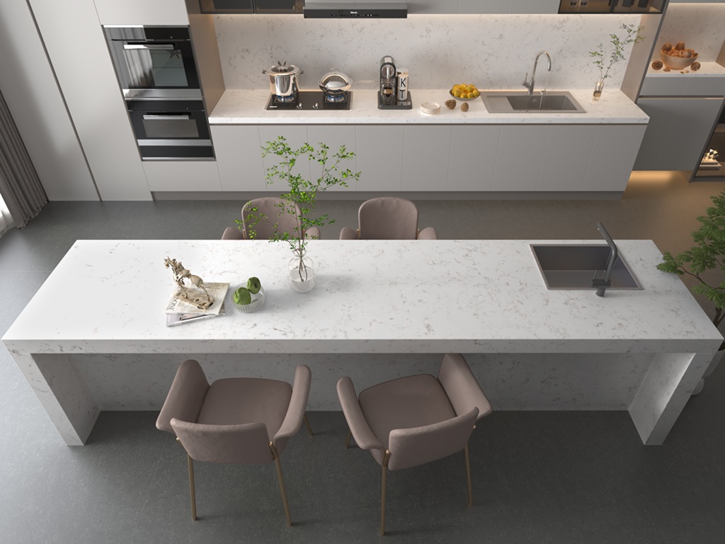 Carrara Quartz Nile Stone is suitable for kitchen worktops, islands, splashbacks, utility areas, and bathroom vanities. Its soft veining and warm white base provide definition without visual heaviness, making it well suited to open-plan spaces and continuous surface applications.