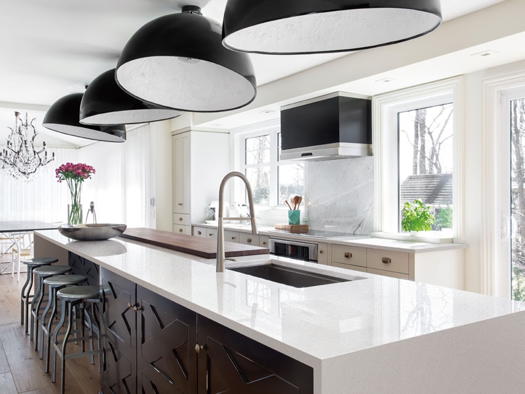 Classic White Quartz is supplied in a jumbo slab size of 3200 × 1600 mm, allowing for expansive layouts with minimal joins across long worktop runs and large islands. Available in both 20 mm and 30 mm thickness options, it supports slim contemporary edges as well as more substantial profiles depending on the look you want to achieve. Mitred detailing, waterfall ends, and full-height splashbacks can be specified to keep the surface reading as one continuous plane, reinforcing the slab’s clean, architectural character while supporting practical design features such as overhangs, end panels, and tidy edge alignment.
