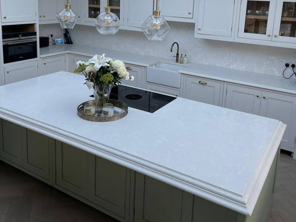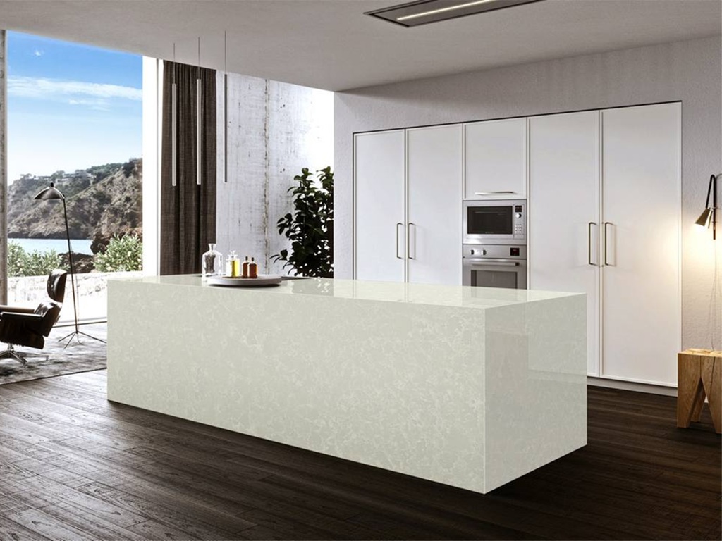 Ice White Quartz Nile Stone is well suited to kitchen worktops, islands, splashbacks, utility areas, and bathroom vanities. Its soft creamy colouring and subtle mineral movement provide a clean backdrop in open-plan layouts, while remaining controlled enough for continuous surface applications where visual calm and consistency are priorities.