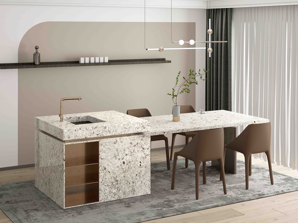 Lavender Quartz Nile Stone works particularly well in interiors that benefit from warmth, texture, and understated contrast. The cream-toned base pairs naturally with painted shaker cabinetry, light oak, and soft neutrals, while the taupe and grey mineral fragments allow it to sit comfortably alongside brushed metals, darker handles, and modern fittings. Used across islands, waterfall ends, or full-height splashbacks, Lavender creates a continuous, stone-like surface that feels detailed up close yet controlled at scale, helping open-plan spaces stay visually connected without appearing busy.