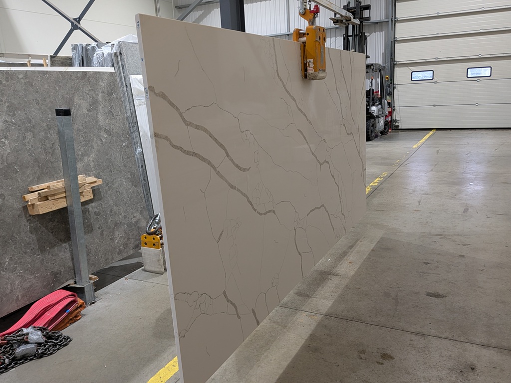 The Statuario quartz from the Nile Stone slab features a bright white base that keeps the surface crisp and open across large areas. Soft grey veining branches naturally through the slab, combining medium-width statement lines with finer hairline detail for a balanced, marble-inspired look. This layered patterning adds definition without overwhelming the background, allowing Statuario Quartz to create clean, architectural surfaces that feel refined and continuous across worktops, islands, and feature installations.