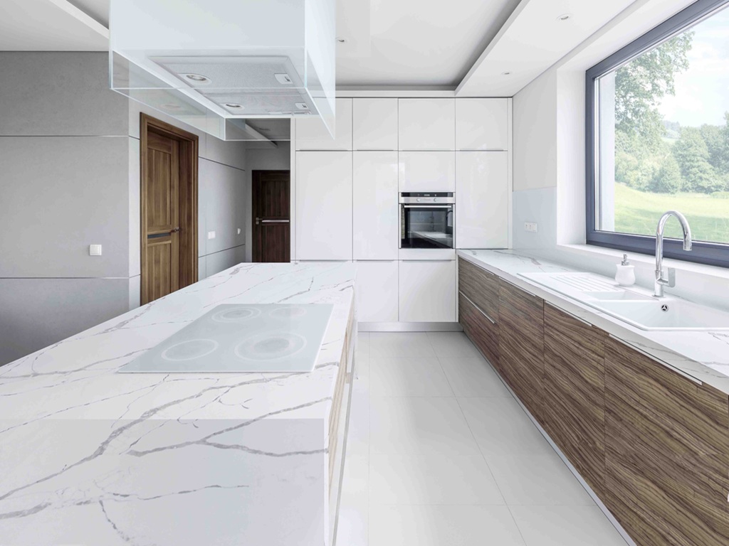 Statuario Quartz Nile Stone works well in interiors that benefit from a clean white foundation with controlled contrast. The soft grey veining pairs naturally with matte black, graphite, or deep-toned cabinetry for a sharper look, while also sitting comfortably alongside light wood, warm neutrals, and off-white units where the veining adds gentle definition. Used on islands, waterfall ends, or full-height splashbacks, the branching vein structure creates a strong focal surface while still reading calm and uncluttered across connected runs.