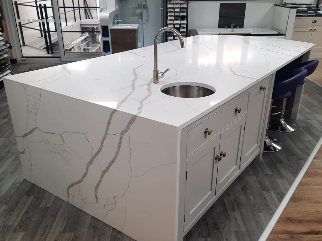 Statuario Quartz Nile Stone is well suited to kitchen worktops, islands, splashbacks, utility areas, and bathroom vanities. Its bright white base helps open up spaces, while the soft grey veining provides definition in open-plan layouts without appearing heavy, making it suitable for continuous surface applications where a consistent, refined look is required.