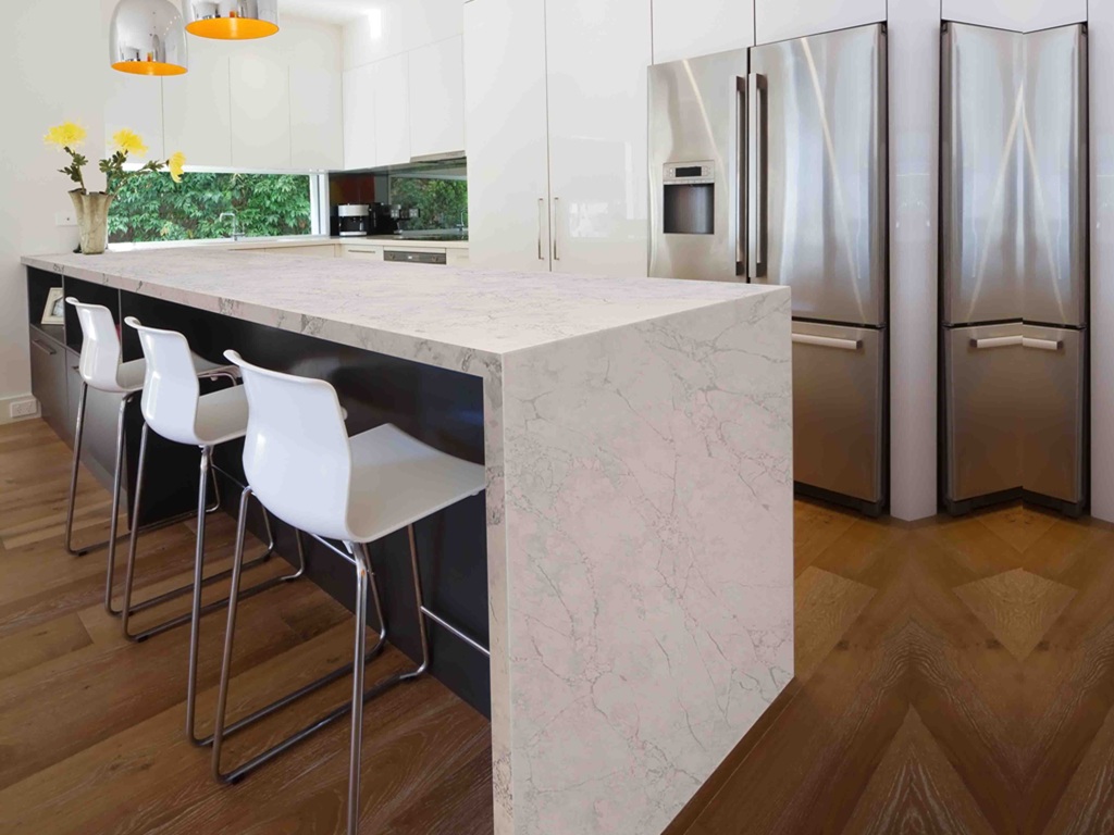 White Eclypse Quartz Nile Stone works particularly well in interiors that benefit from subtle movement and light contrast. The soft veining pairs naturally with neutral, grey, or wood-toned cabinetry, while also complementing darker finishes without appearing stark. Used on islands, waterfall ends, or full-height splashbacks, the slab’s gentle flow creates focal interest while preserving a calm, cohesive visual rhythm throughout the space.