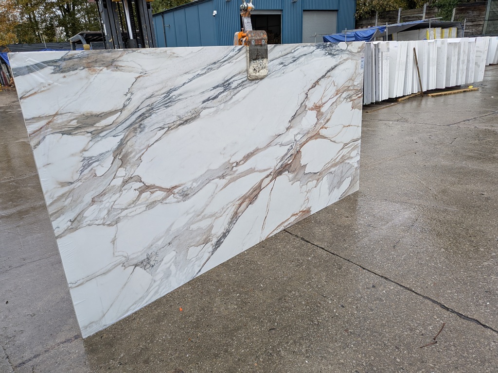 The Calacatta Borghini 3D Quartz from Noble Stone slab features a crisp white base layered with expressive multi-tonal veining that delivers dramatic architectural movement across the surface. Bold flowing veins in warm gold, taupe, and charcoal grey sweep diagonally through the slab, interlaced with fine grey hairline detail that adds mineral depth and natural variation. This striking composition creates a confident visual presence while maintaining refined balance, making Calacatta Borghini 3D Quartz particularly effective across large worktop runs, statement islands, and feature installations.