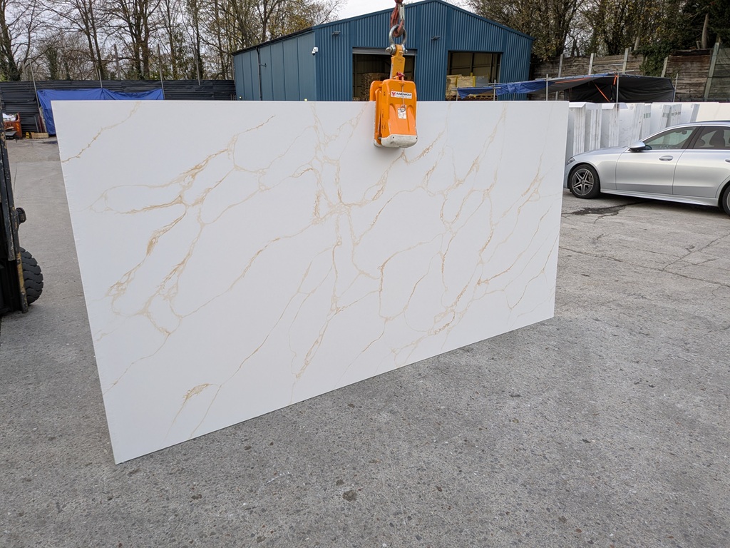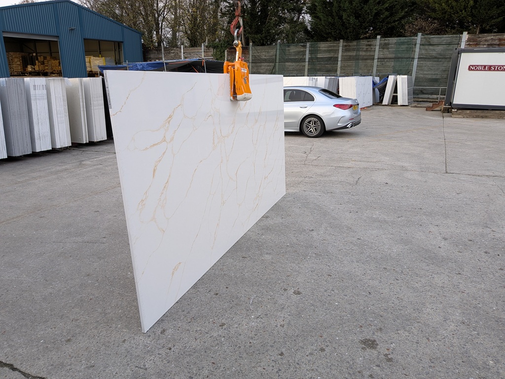 The Calacatta Golden quartz from Noble Stone slab features a soft warm white base that keeps the surface bright while introducing a gentle, creamy tone. Flowing golden-beige veining sweeps across the slab in long arcs and branching connections, forming a distinctive Calacatta-style pattern with natural variation in vein width and intensity. The movement remains expressive without becoming overcrowded, leaving calm white areas between major lines so the surface feels balanced and refined. This combination gives Calacatta Golden Quartz a confident presence across large worktop runs, islands, and statement splashbacks where continuous pattern flow is a key part of the design.