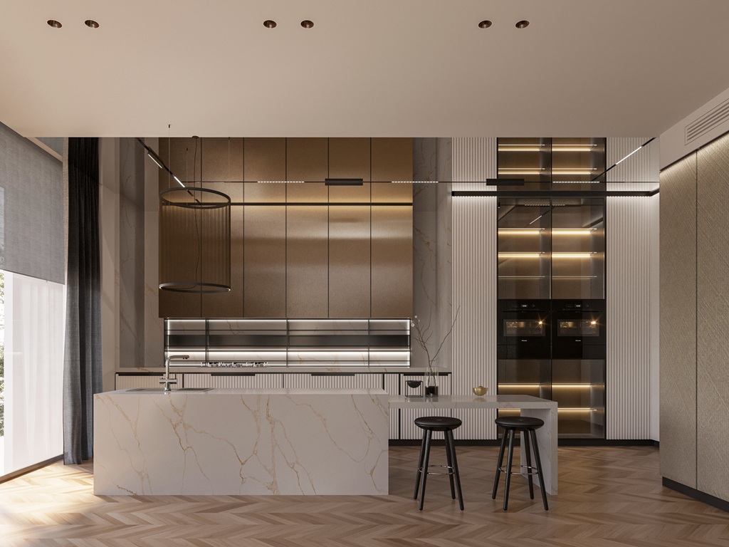 Calacatta Golden Quartz Noble Stone is well suited to kitchen worktops, islands, splashbacks, utility areas, and bathroom vanities. Its warm white base keeps spaces bright, while the golden-beige veining adds definition and character for statement installations. The balanced patterning works well in open-plan layouts where continuity and a cohesive material palette are important, and it remains controlled enough for larger surface applications without overwhelming surrounding finishes.