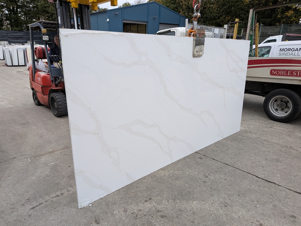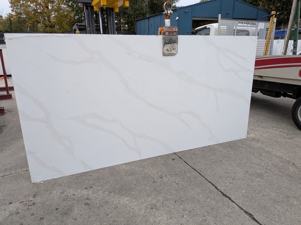 Calacatta Oro Quartz Noble Stone is well suited to kitchen worktops, islands, splashbacks, utility areas, and bathroom vanities. Its soft white base keeps spaces feeling bright and open, while the flowing grey veining adds structure across open-plan layouts. The delicate gold accents bring warmth and highlight detail, making it an excellent choice for continuous surfaces where a luxury marble-inspired statement is desired without heavy contrast dominating the room.