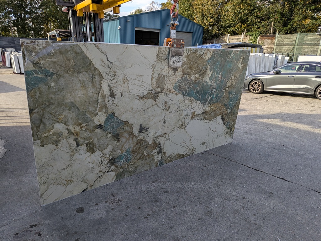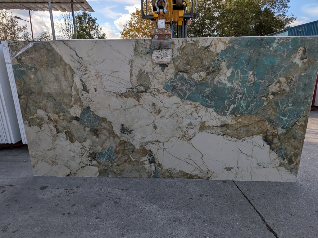 The Calacatta Oslo 3D Quartz from Noble Stone slab presents an extraordinary exotic-stone aesthetic that delivers bold visual drama and natural mineral depth across the surface. A soft white base is fractured with expressive mineral formations in teal blue-green pools, warm gold and beige veining, and charcoal graphite hairline detail. This richly layered composition creates striking movement and premium texture, making Calacatta Oslo 3D Quartz a powerful design statement across large islands, waterfall features, and architectural feature walls.