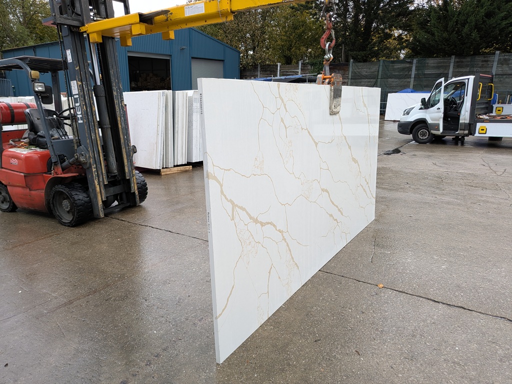 Calacatta Sydney Gold Quartz is supplied in a jumbo slab size of 3200 × 1600 mm, allowing for expansive layouts with minimal joins across long worktop runs and large islands. Available in both 20 mm and 30 mm thickness options, it supports slim contemporary edges as well as more substantial profiles. Mitred edges, waterfall ends, and full-height splashbacks can be specified to maintain natural vein flow and visual continuity across surfaces.