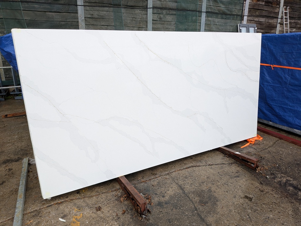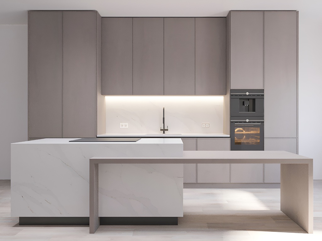 Calacatta Tala Quartz is supplied in a jumbo slab size of 3200 × 1600 mm, allowing for expansive layouts with minimal joins across long worktop runs and feature islands. Available in both 20 mm and 30 mm thickness options, it supports streamlined contemporary edges as well as more substantial profiles. Mitred edges, waterfall ends, and full-height splashbacks can be specified to carry veining naturally across planes and maintain strong visual continuity throughout the space.