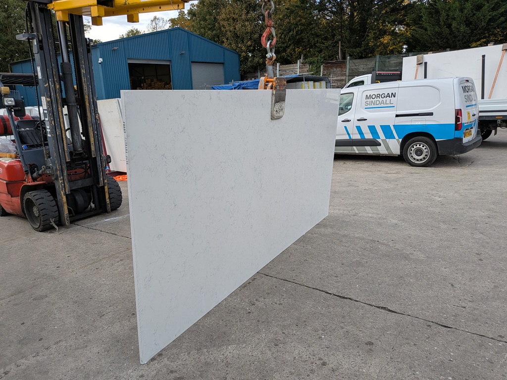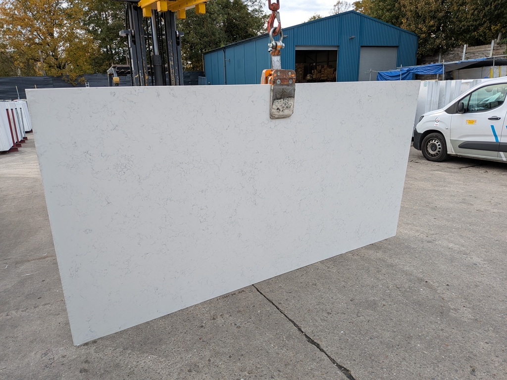 Carrara Jade Quartz Noble Stone is suitable for kitchen worktops, islands, splashbacks, utility rooms, and bathroom vanities. Its clean white background and fine grey mineral webbing make it particularly effective in open-plan layouts and modern interiors where continuity and calm visual structure are key priorities.