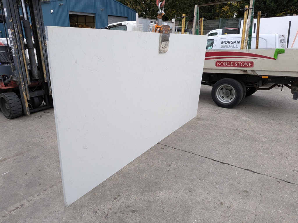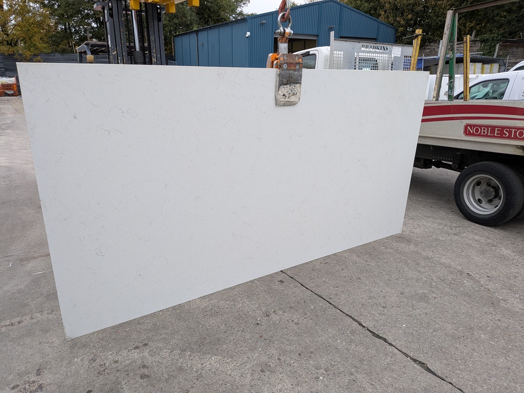 The Carrara Sahara quartz from Noble Stone slab features a soft warm white base layered with delicate micro grey veining that appears gently dispersed across the surface. Fine broken vein detailing and light mineral flecking create a calm, stone-inspired character without bold directional movement. This subtle patterning allows Carrara Sahara Quartz to deliver a refined natural look while maintaining visual balance across large worktop runs, islands, and architectural installations.