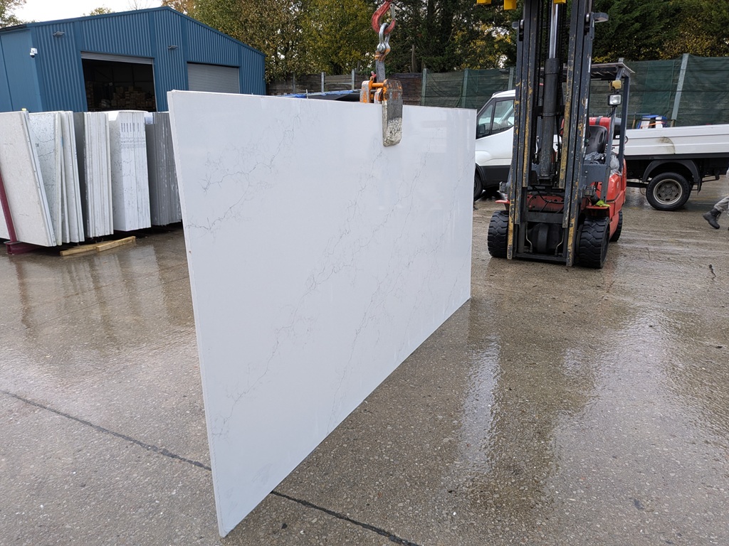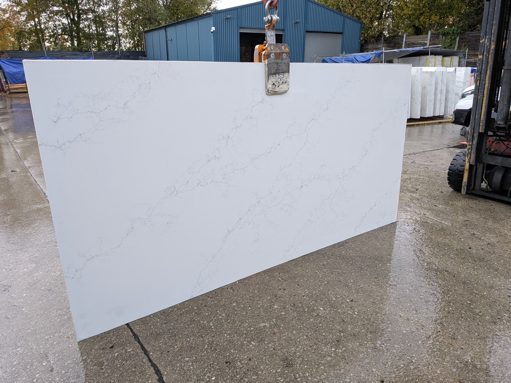 The Harmony White quartz from Noble Stone slab features a bright clean white base layered with fine flowing grey micro-veining that moves softly across the surface. The gentle diagonal vein structure introduces light natural movement while maintaining strong surface clarity, allowing the slab to remain visually balanced across large worktop runs, feature islands, and contemporary architectural installations.