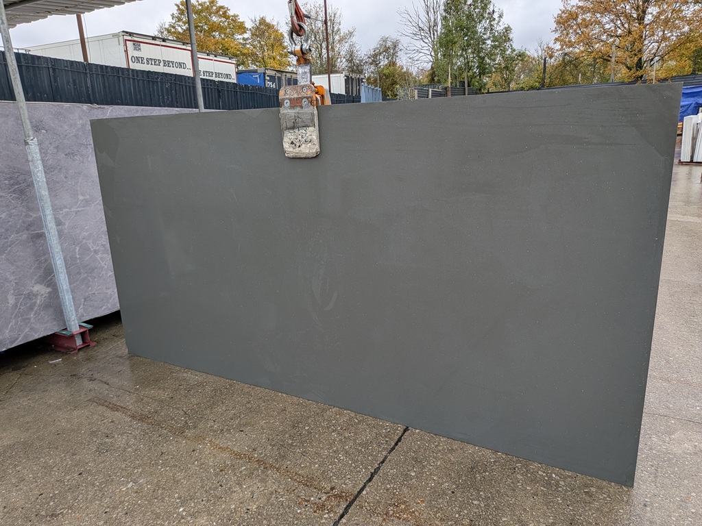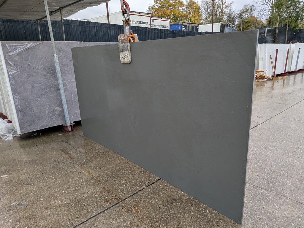 The Lustre Grey quartz from Noble Stone slab presents a deep charcoal–mid grey base that delivers a bold, contemporary surface with refined visual control. Subtle clouded mineral movement flows softly across the slab, layered with fine dispersed mineral flecks that gently catch light without introducing heavy patterning. This clean and minimal aesthetic creates a monolithic architectural appearance that remains balanced and sophisticated, making Lustre Grey Quartz particularly effective across large worktop runs, waterfall islands, and modern feature installations.