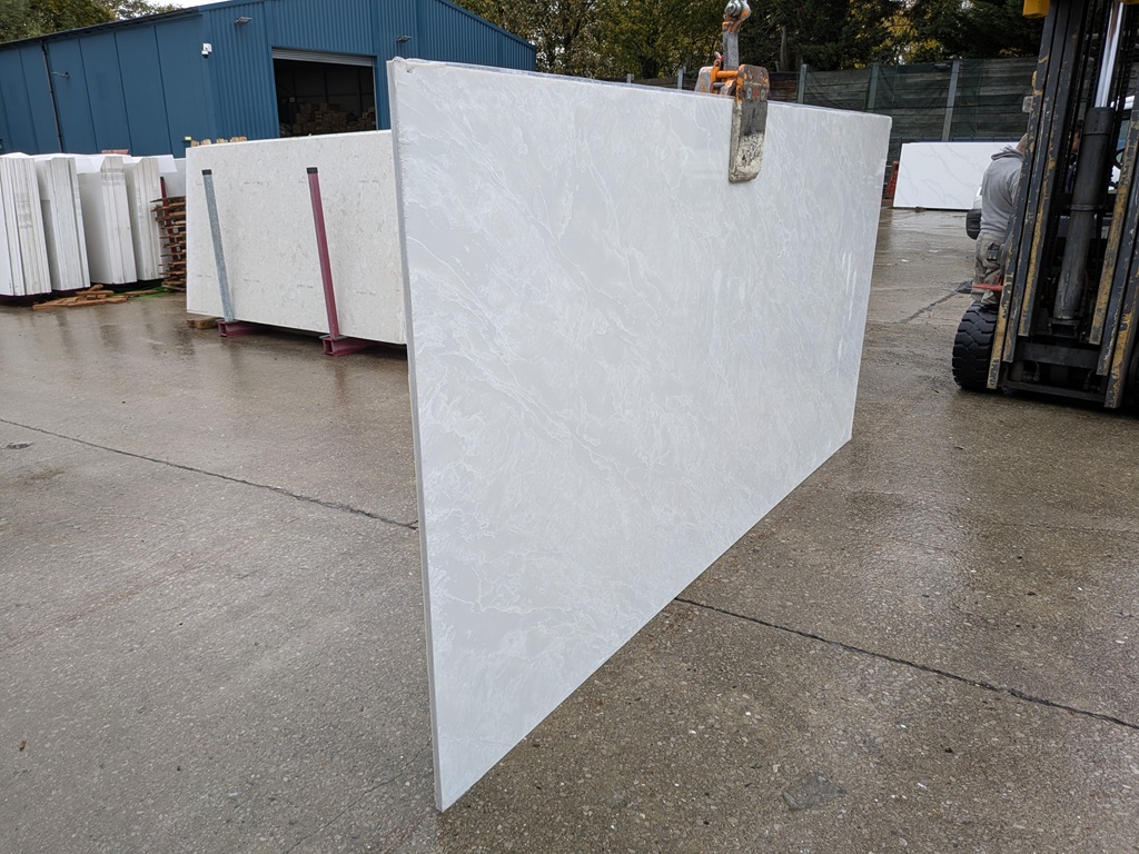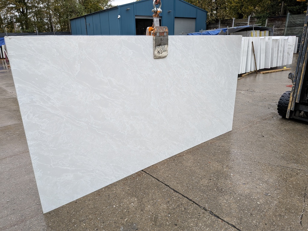 Onyx Ice Quartz is supplied in a jumbo slab size of 3200 × 1600 mm, allowing for expansive layouts with minimal joins across long worktop runs and large feature installations. Available in both 20 mm and 30 mm thickness options, it supports streamlined contemporary edges as well as more substantial profiles. Mitred detailing, waterfall ends, and full-height splashbacks can be specified to carry the slab’s luminous mineral flow naturally across planes and maintain strong visual continuity.
