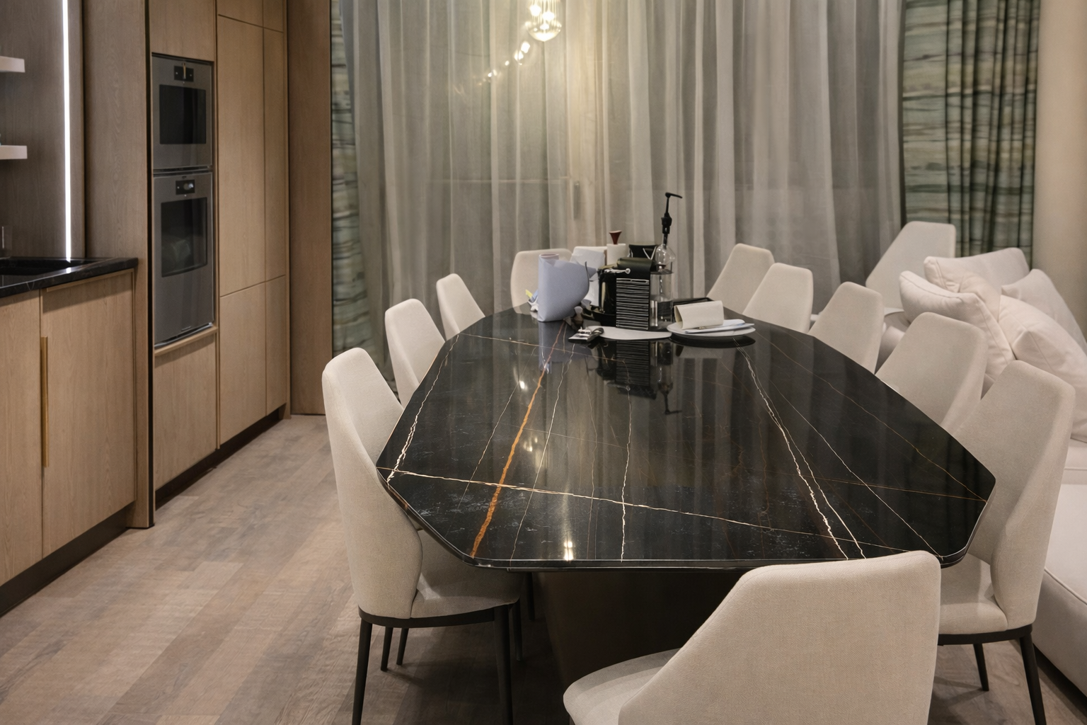 Sahara Noir Quartz Noble Stone routine care involves wiping the surface with warm water and a mild, pH-neutral cleaner. Spills should be cleaned promptly to maintain surface clarity, particularly around high-use zones such as hobs, sinks, and preparation areas. Heat protection is recommended by using trivets beneath hot cookware, and abrasive pads or acidic cleaners should be avoided to protect the polished finish and keep the surface looking consistent under strong lighting.