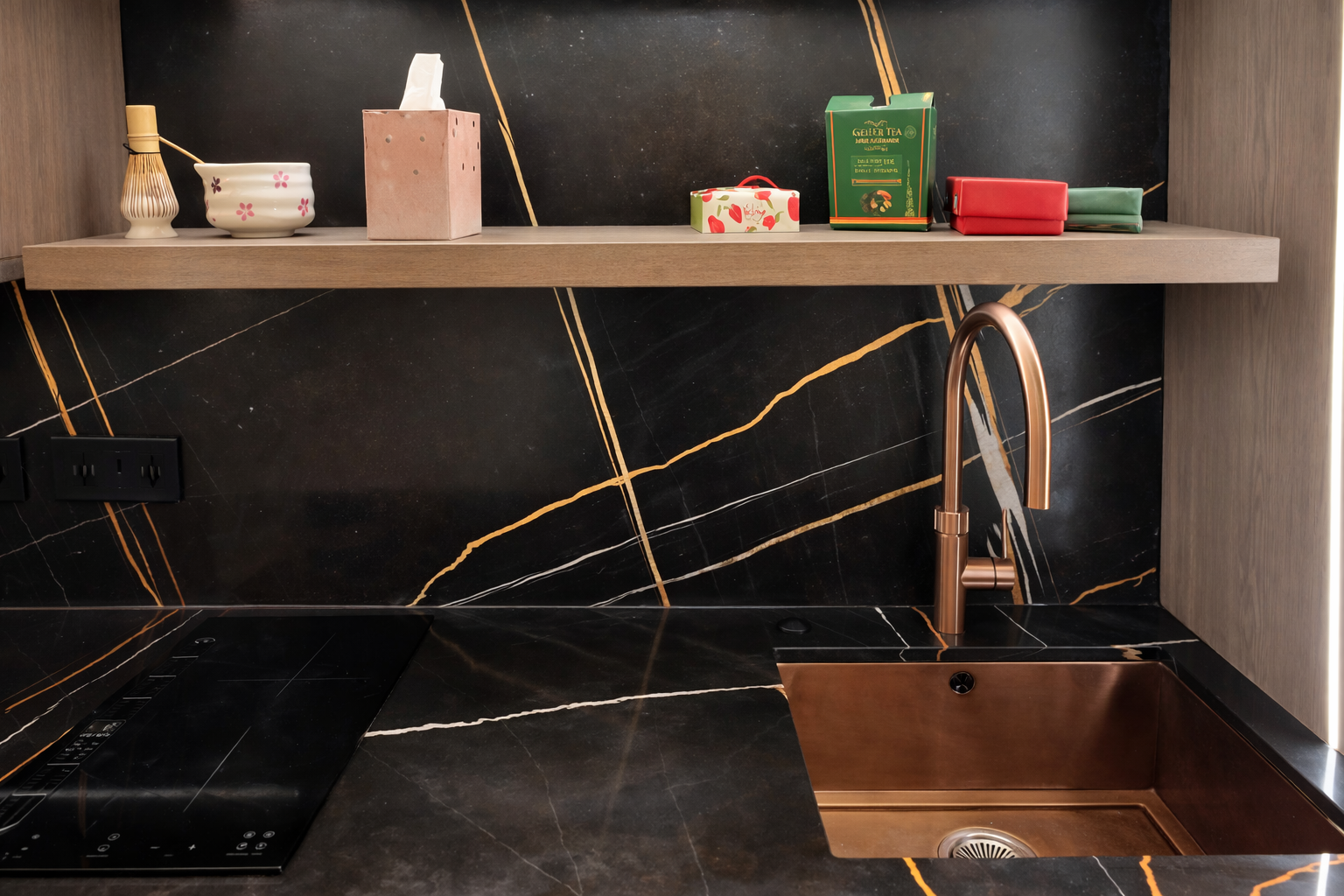 Careful planning of line direction, joints, and edge profiles ensures Sahara Noir Quartz reads cleanly across sinks, hobs, corners, and feature ends. Accurate slab alignment and fabrication detailing help preserve the design’s structured rhythm, keeping copper and silver-white lines visually coherent across joins while supporting long-term performance in everyday environments.