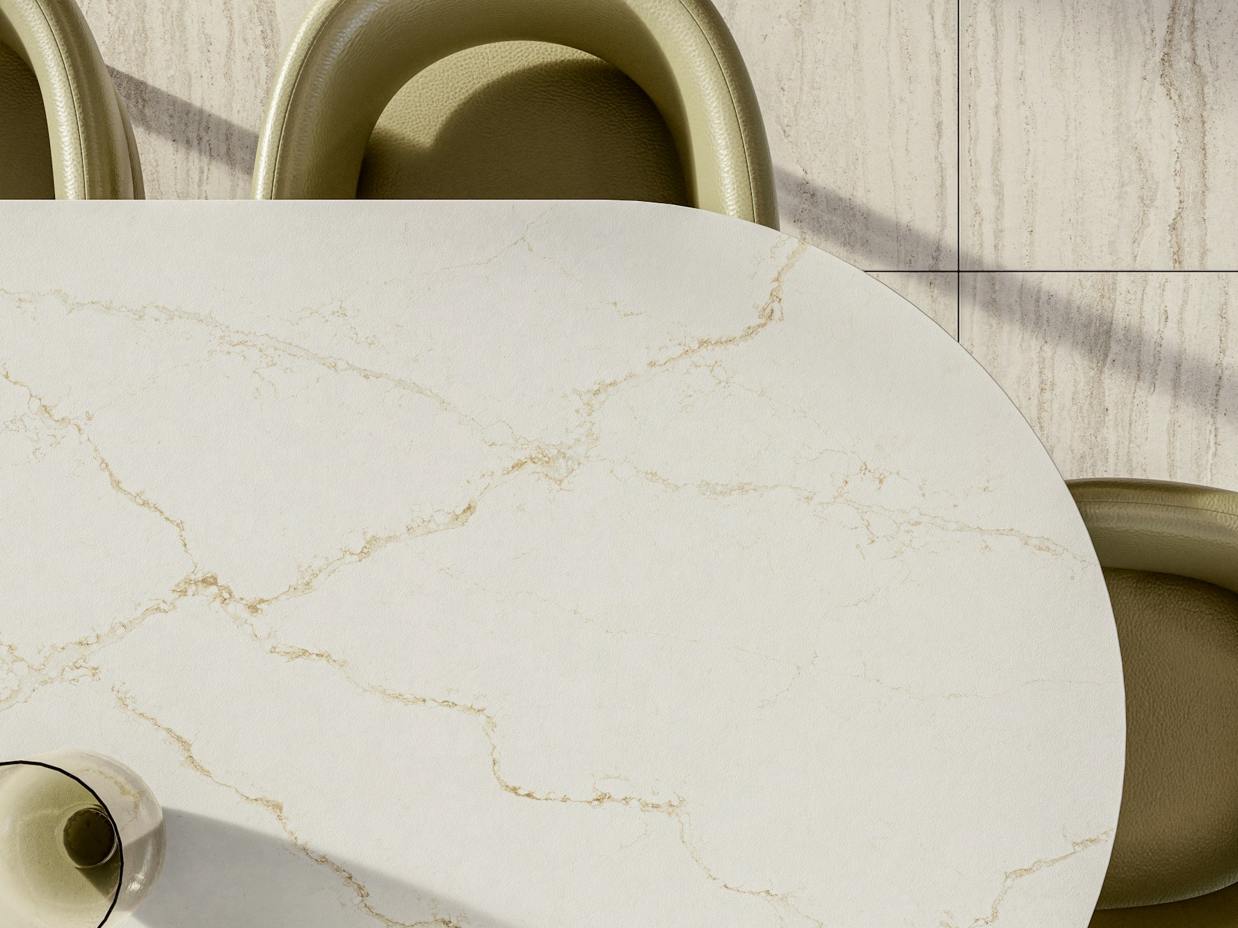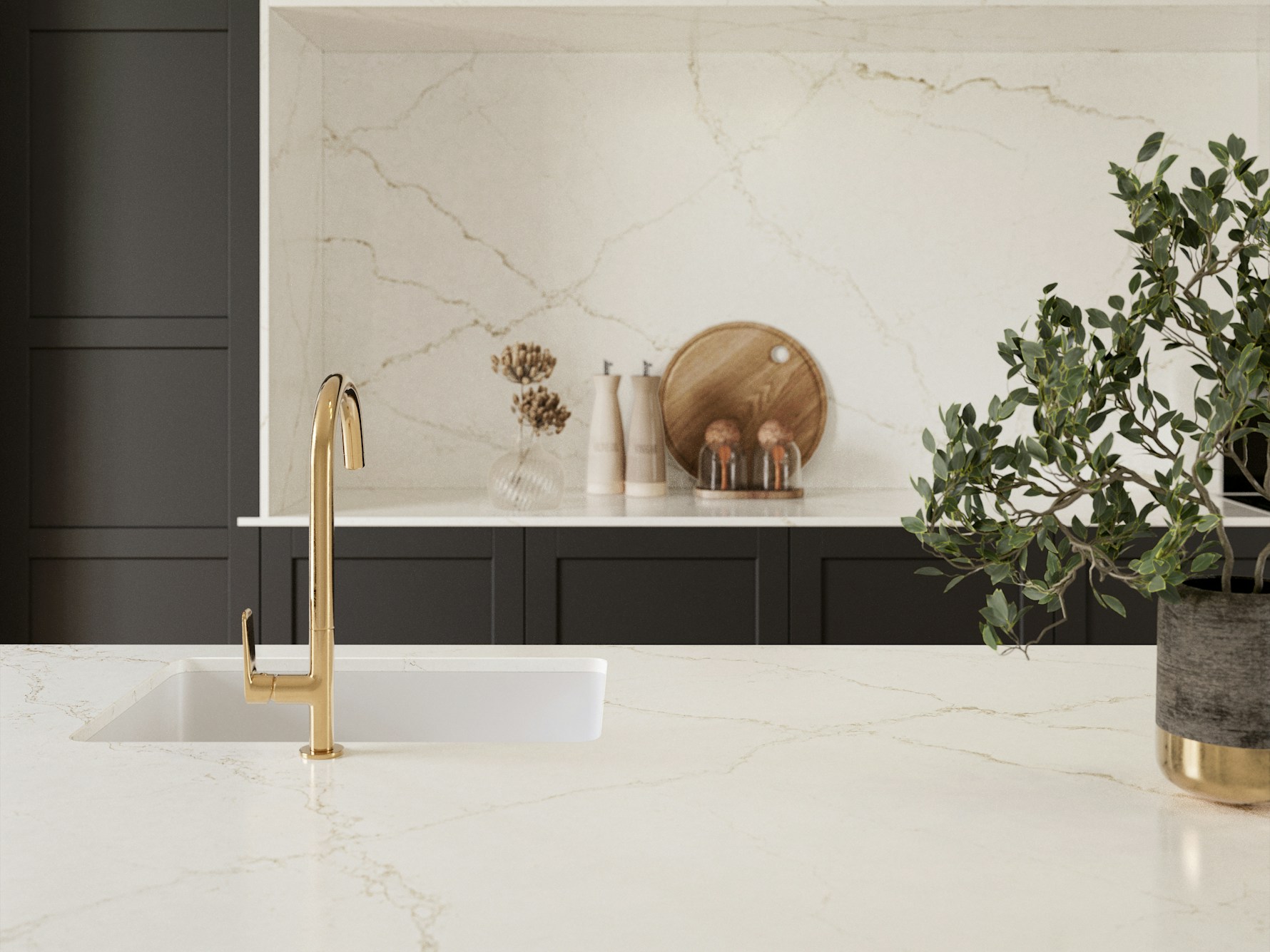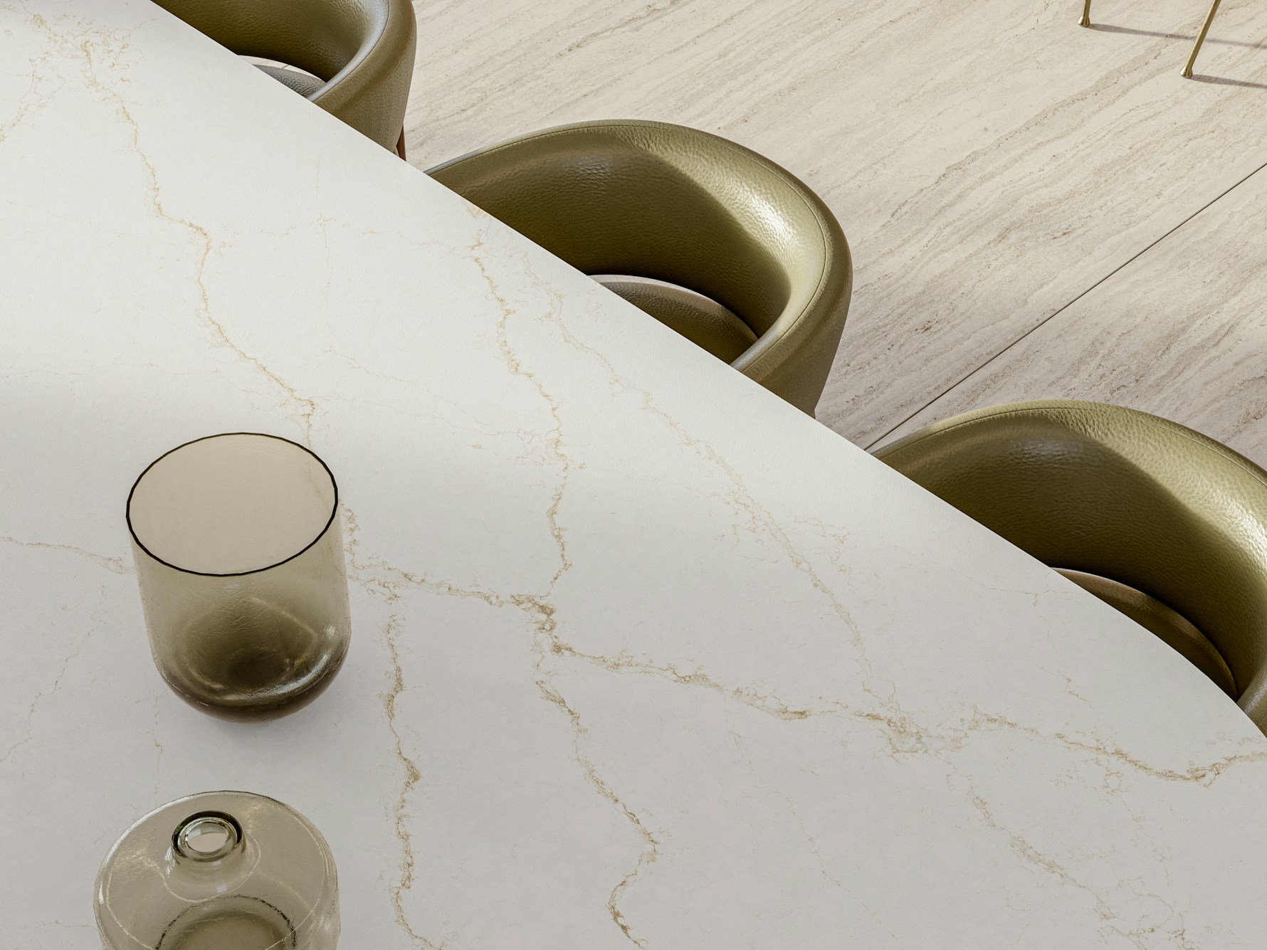 Blanc Élysée works particularly well in interiors that aim for a light, elegant atmosphere with gentle warmth. Pair it with off-white, sand, or greige cabinetry for a tonal scheme that feels cohesive and open, or introduce contrast through muted charcoal and soft black accents without overpowering the veining. Champagne or brushed brass hardware naturally echoes the beige veins, while brushed nickel creates a cooler, more minimal balance. Using the slab on an island with waterfall edges or as a full-height splashback helps the fine veining read as one continuous, flowing surface.