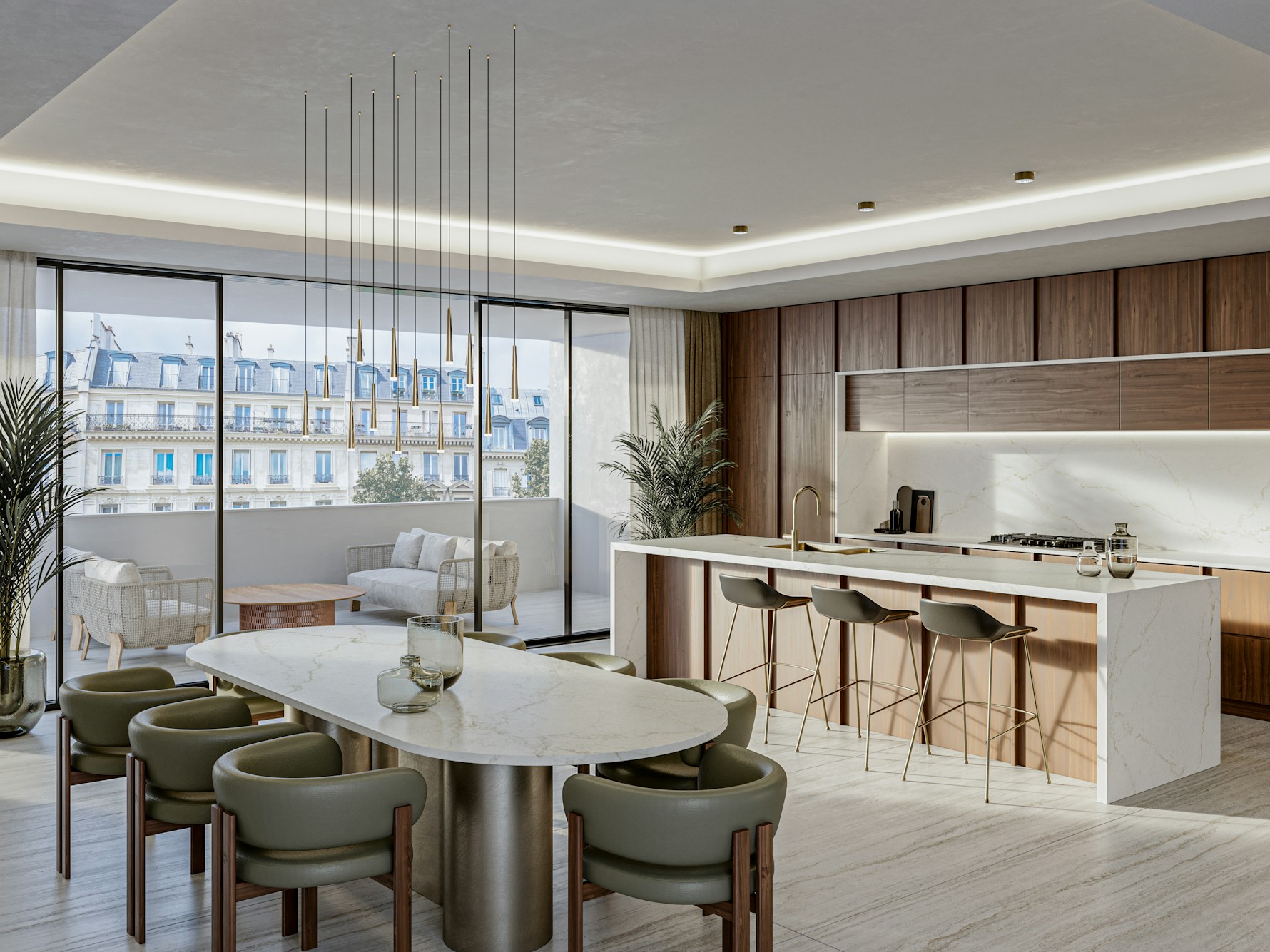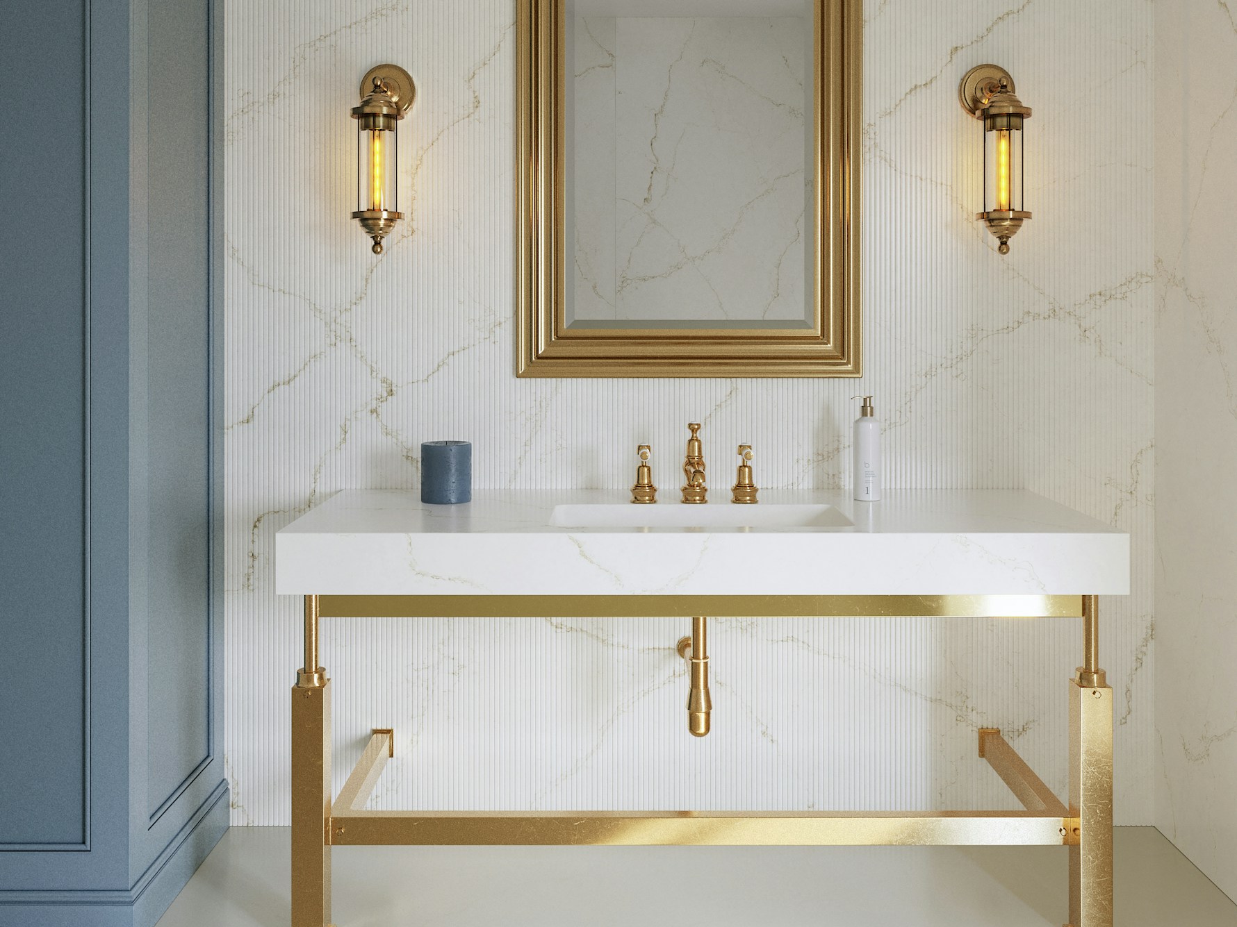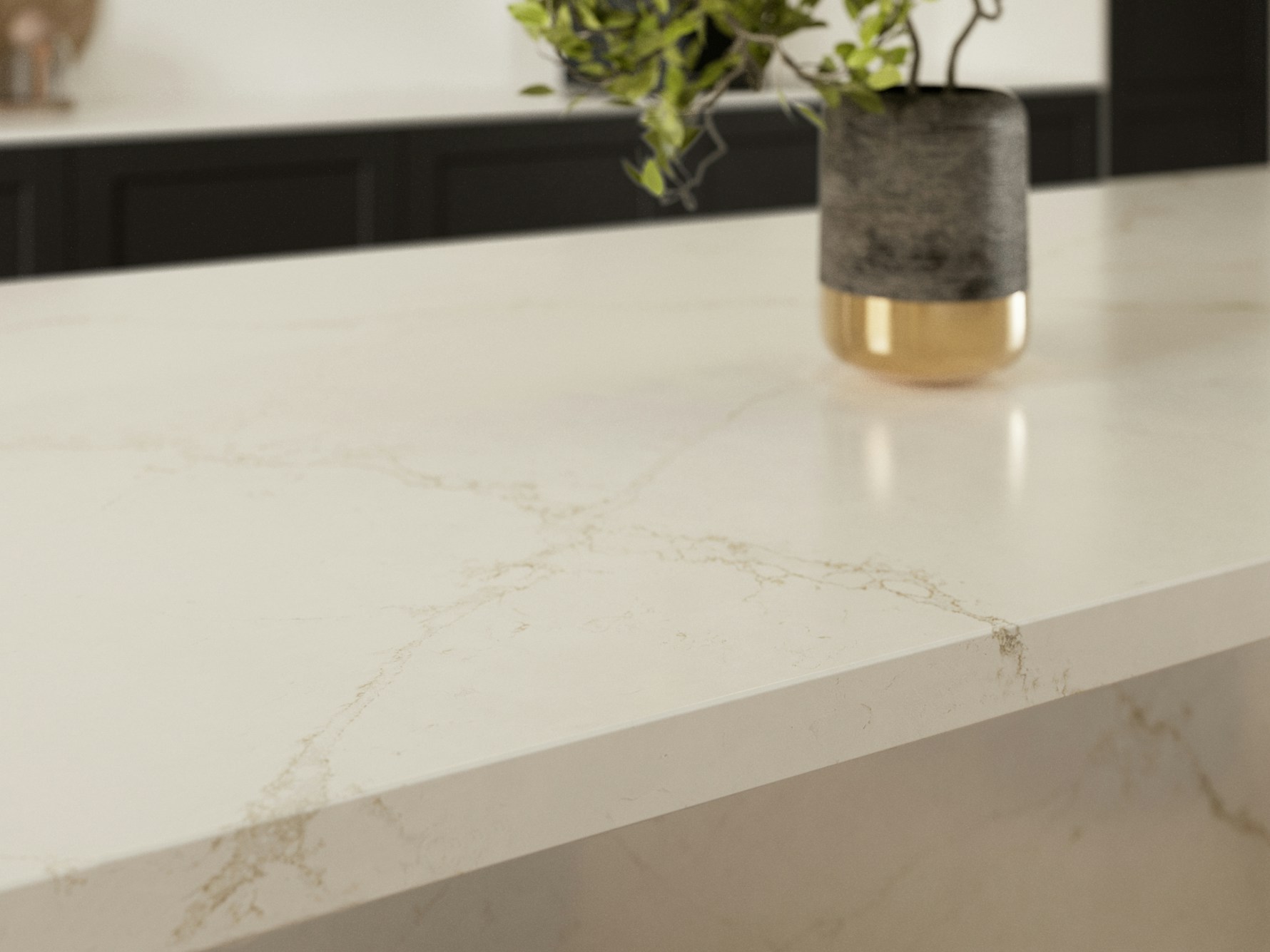 Blanc Élysée works particularly well in interiors that aim for a light, elegant atmosphere with gentle warmth. Pair it with off-white, sand, or greige cabinetry for a tonal scheme that feels cohesive and open, or introduce contrast through muted charcoal and soft black accents without overpowering the veining. Champagne or brushed brass hardware naturally echoes the beige veins, while brushed nickel creates a cooler, more minimal balance. Using the slab on an island with waterfall edges or as a full-height splashback helps the fine veining read as one continuous, flowing surface.