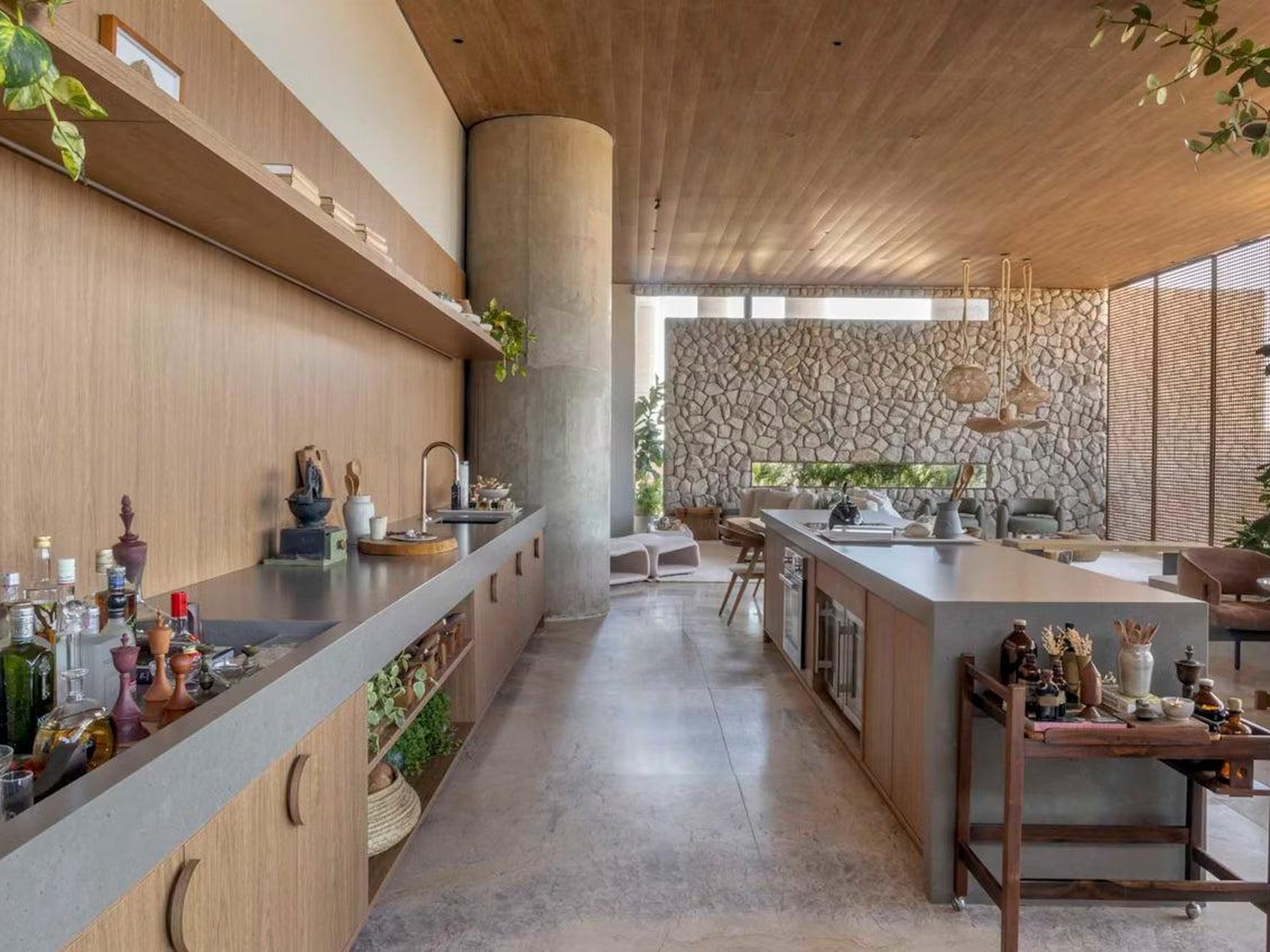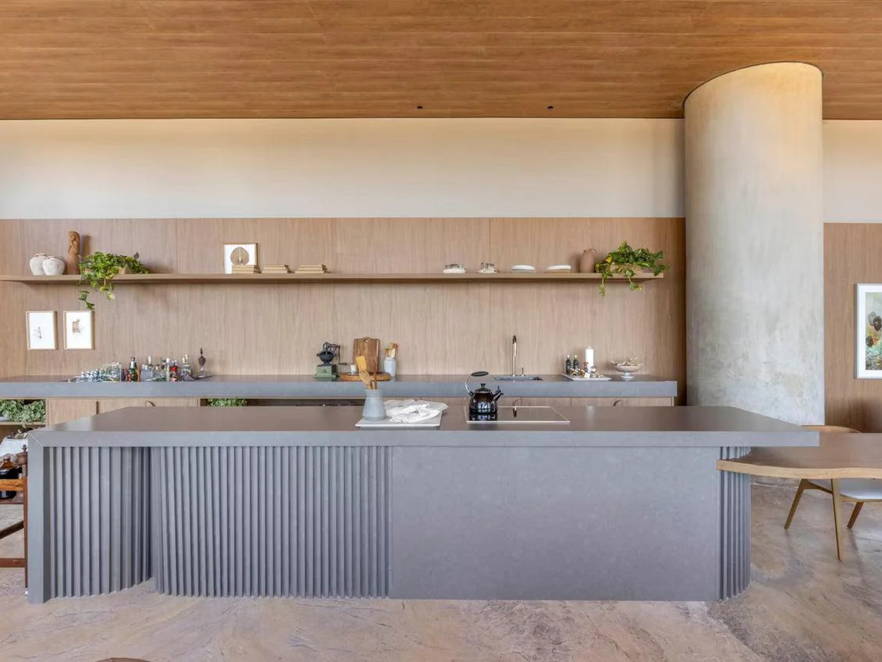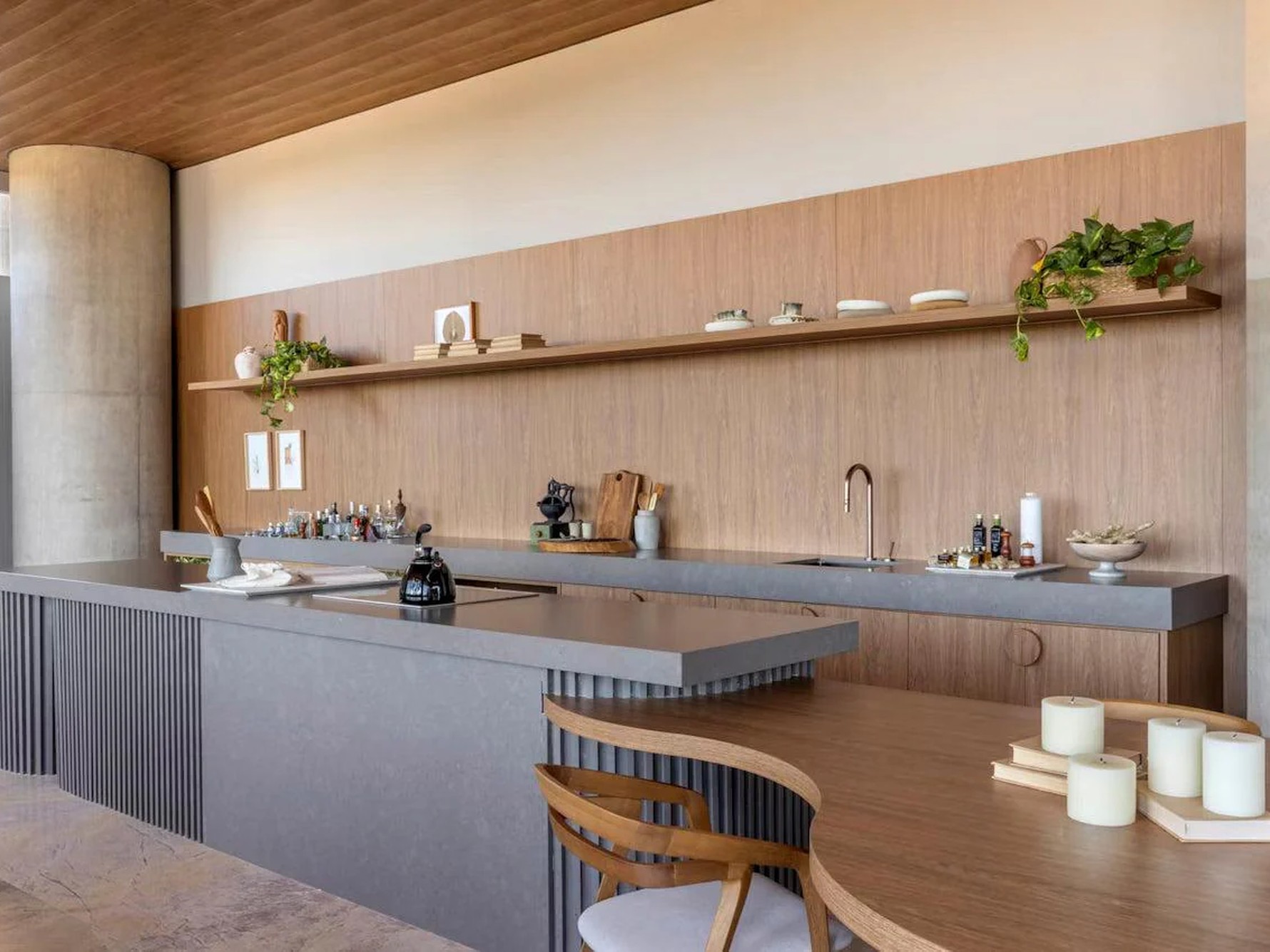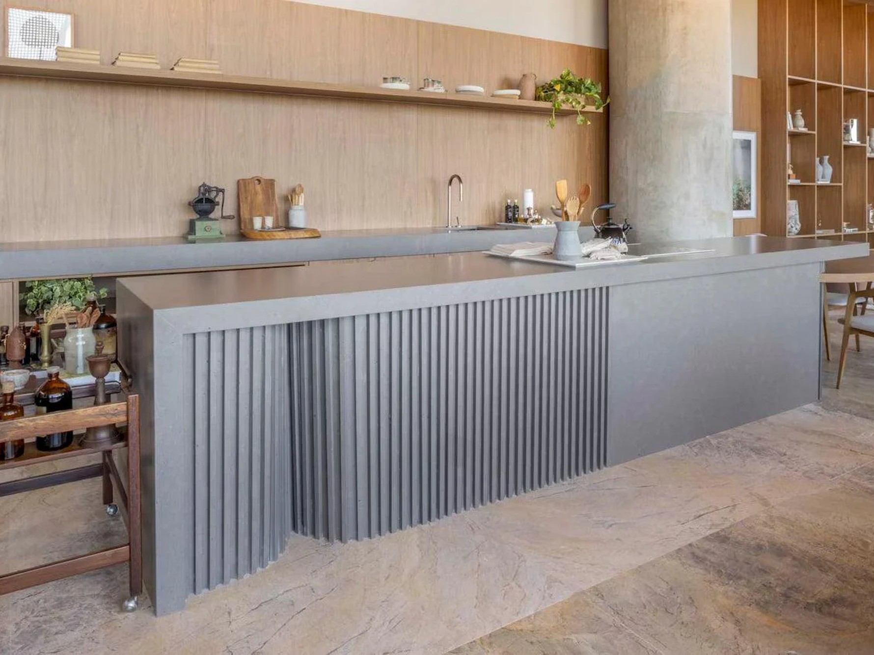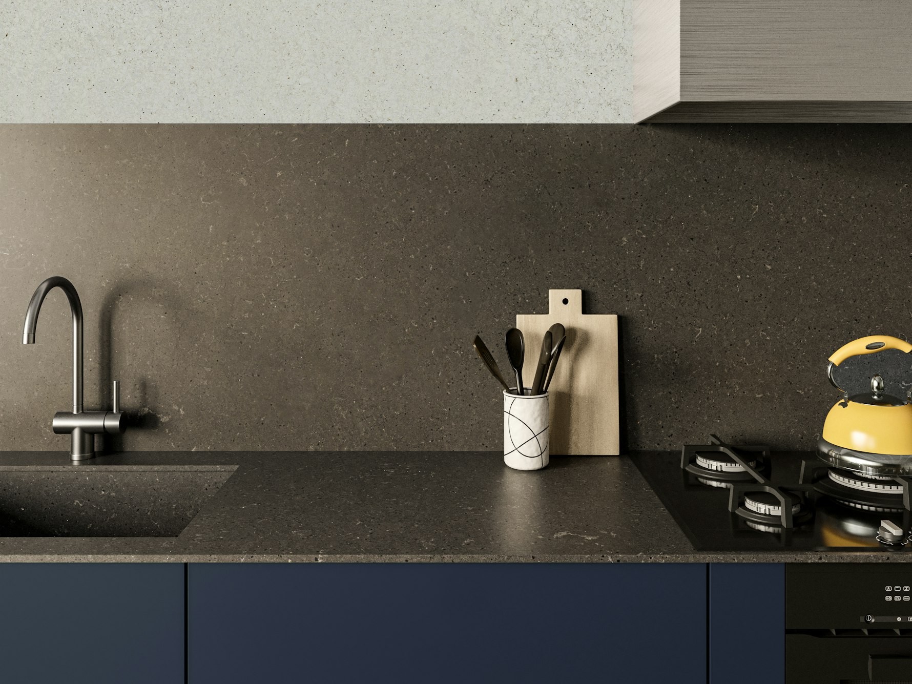 Brass Relish pairs naturally with soft neutrals, warm woods, and muted cabinetry tones such as greige, sand, and mushroom. Its subtle brass accents work well alongside brushed brass, bronze, or champagne hardware, while matte black details provide gentle contrast. The slab’s even texture makes it ideal for long worktop runs, islands, and integrated splashbacks where visual continuity is important and bold veining would feel overpowering.