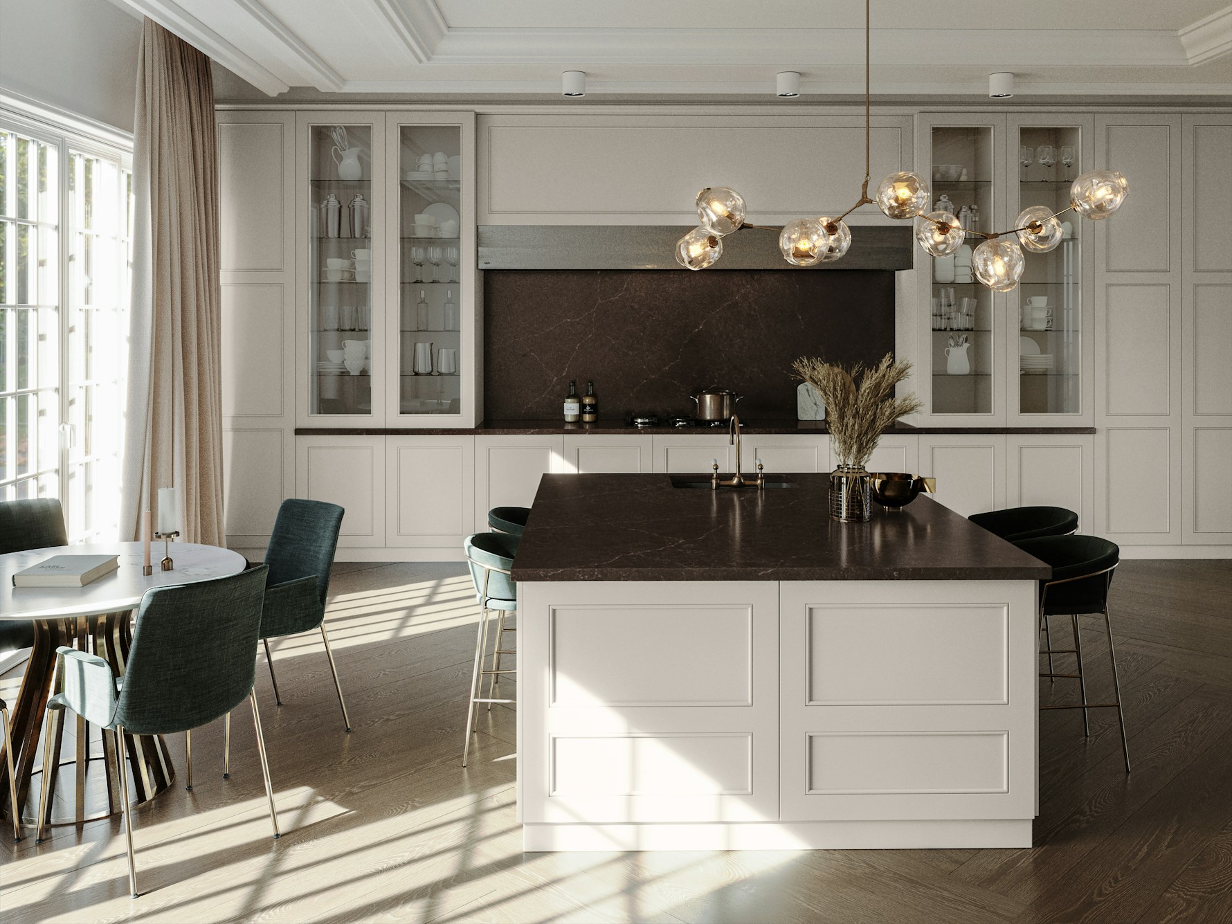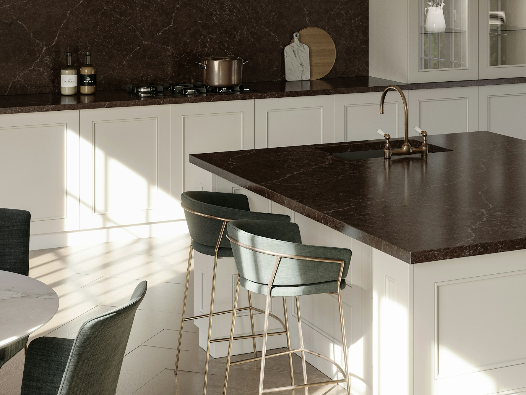 Château Brown works especially well with warm cabinetry tones such as walnut, espresso, and soft taupe, as well as lighter neutrals that allow the depth of the slab to stand out. Brushed brass, bronze, and aged metal finishes complement the subtle veining, while darker accents create a cohesive, layered look. The stone’s controlled pattern makes it suitable for large islands, wraparound worktops, and statement surfaces without overwhelming the space.