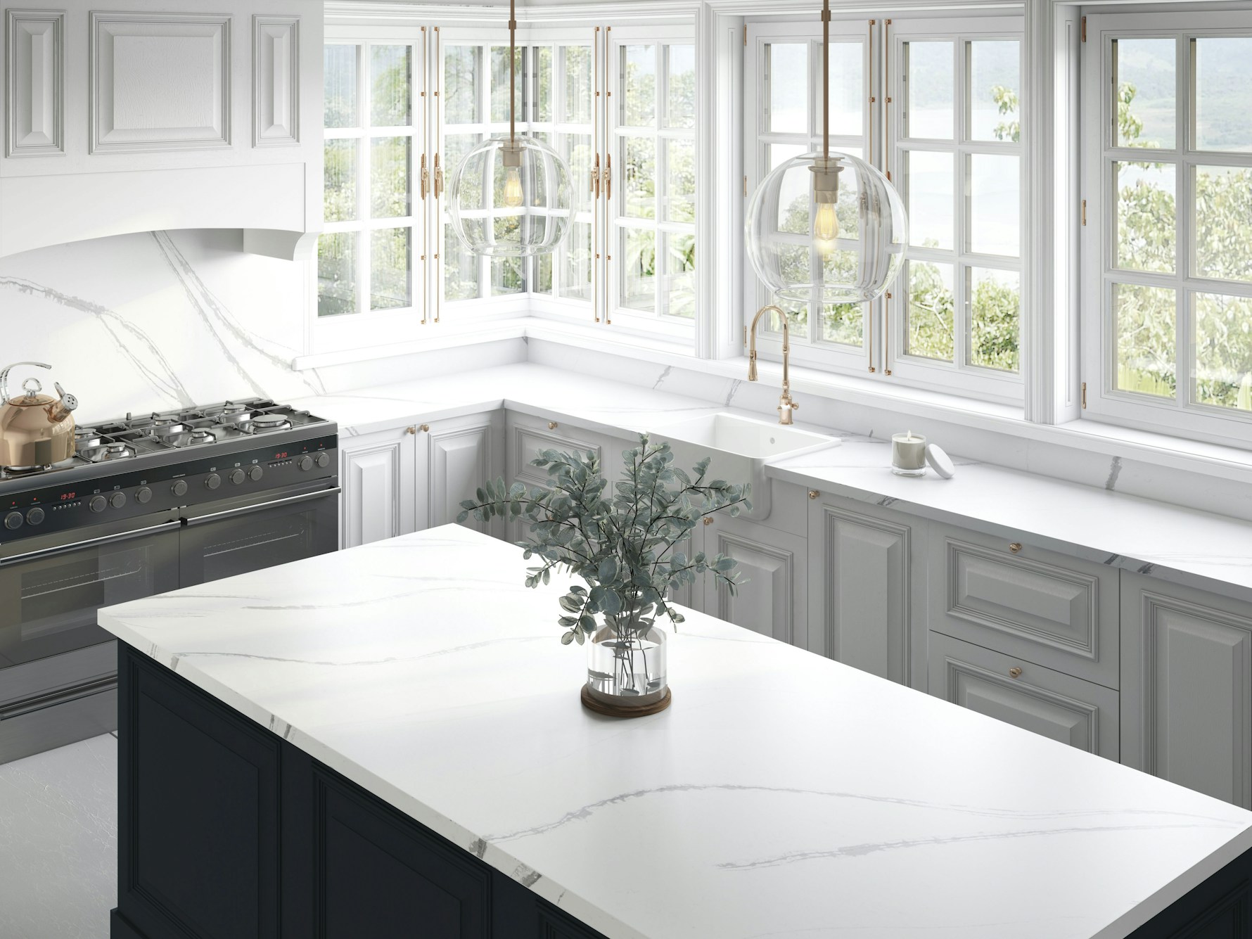 Et Bella Quartz is supplied in a jumbo slab size of 3200 × 1600 mm, allowing for long worktop runs and expansive island layouts with minimal joins. Available in both 20mm and 30mm thickness options, it supports slim contemporary edges as well as more substantial profiles. Mitred edges, waterfall ends, and full-height splashbacks can be specified to carry the linear veining naturally across surfaces and maintain visual continuity.